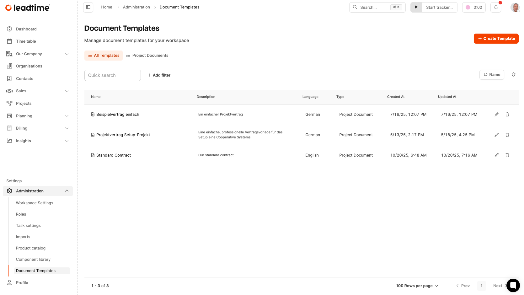 Management happens centrally under Administration → Document Templates. Templates consist of: