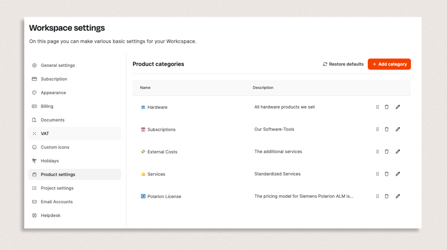 In the Product settings section, you manage your company's product categories. This is where you define how your products and services are structured – for example, into Hardware, Software, Services or Subscriptions. Having clear categories makes it easier to assign products in quotes, invoices, and projects.