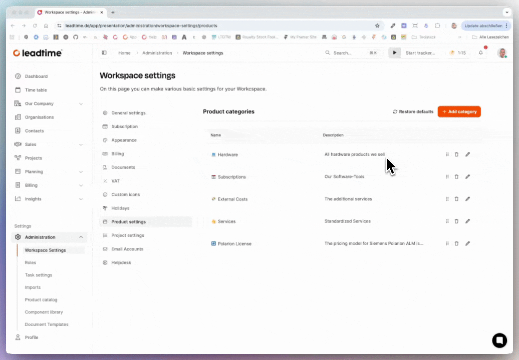 If you don't need your custom changes anymore, you can use "Restore default" to re-enable the original categories from Leadtime. That way you quickly get a clean starting point.