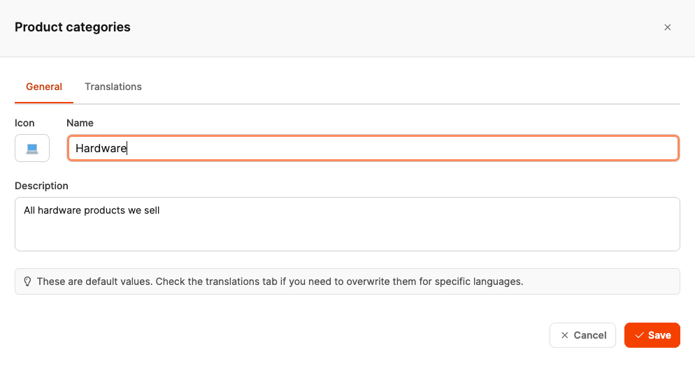 In the "Translations" tab, you can enter names and descriptions in other languages, like English and German.