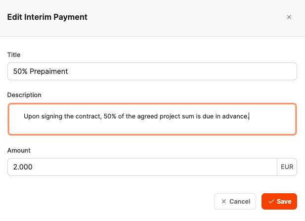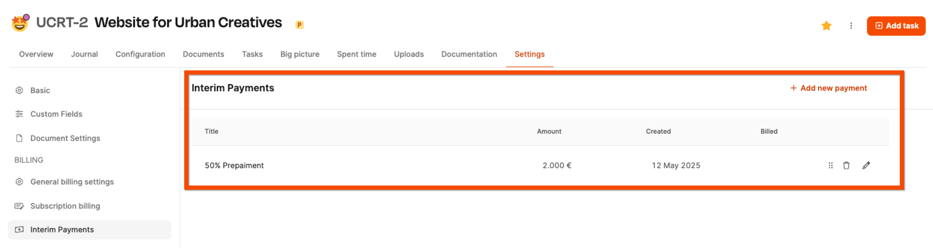 If a partial invoice or an advance payment was defined in the project (e.g. 50% deposit at the start of the project), this will show up as its own invoice of the type “interim payment” – with a clearly marked manual line item.