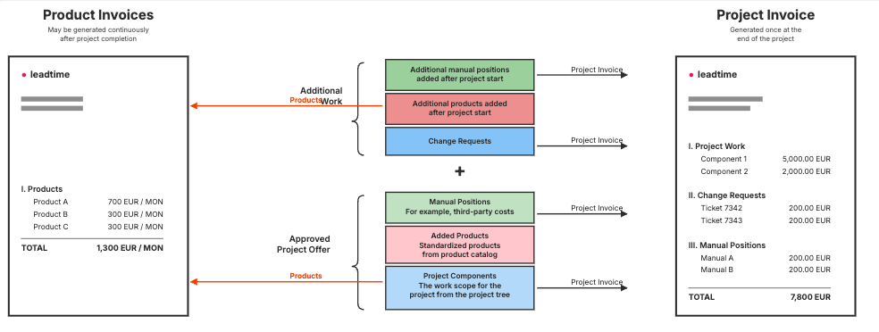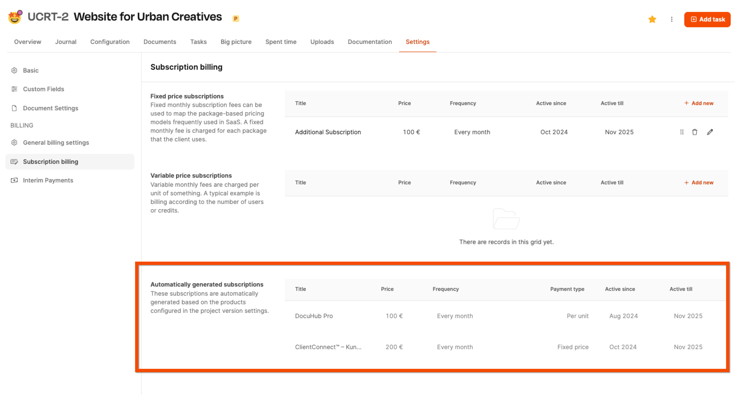 If the project contains subscriptions from the product catalog (e.g. a monthly CRM module), then from the start of billing, a separate subscription invoice will show up regularly – at the frequency stored in the product.