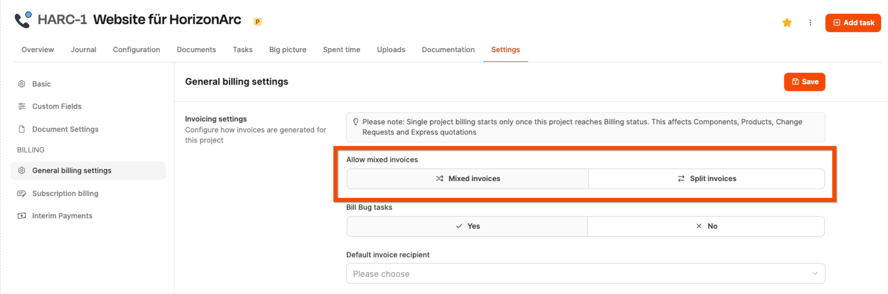 To separate the billing, go to the “Settings” tab and open the general billing settings and set the option “Allow mixed invoices” to “Split invoices”.