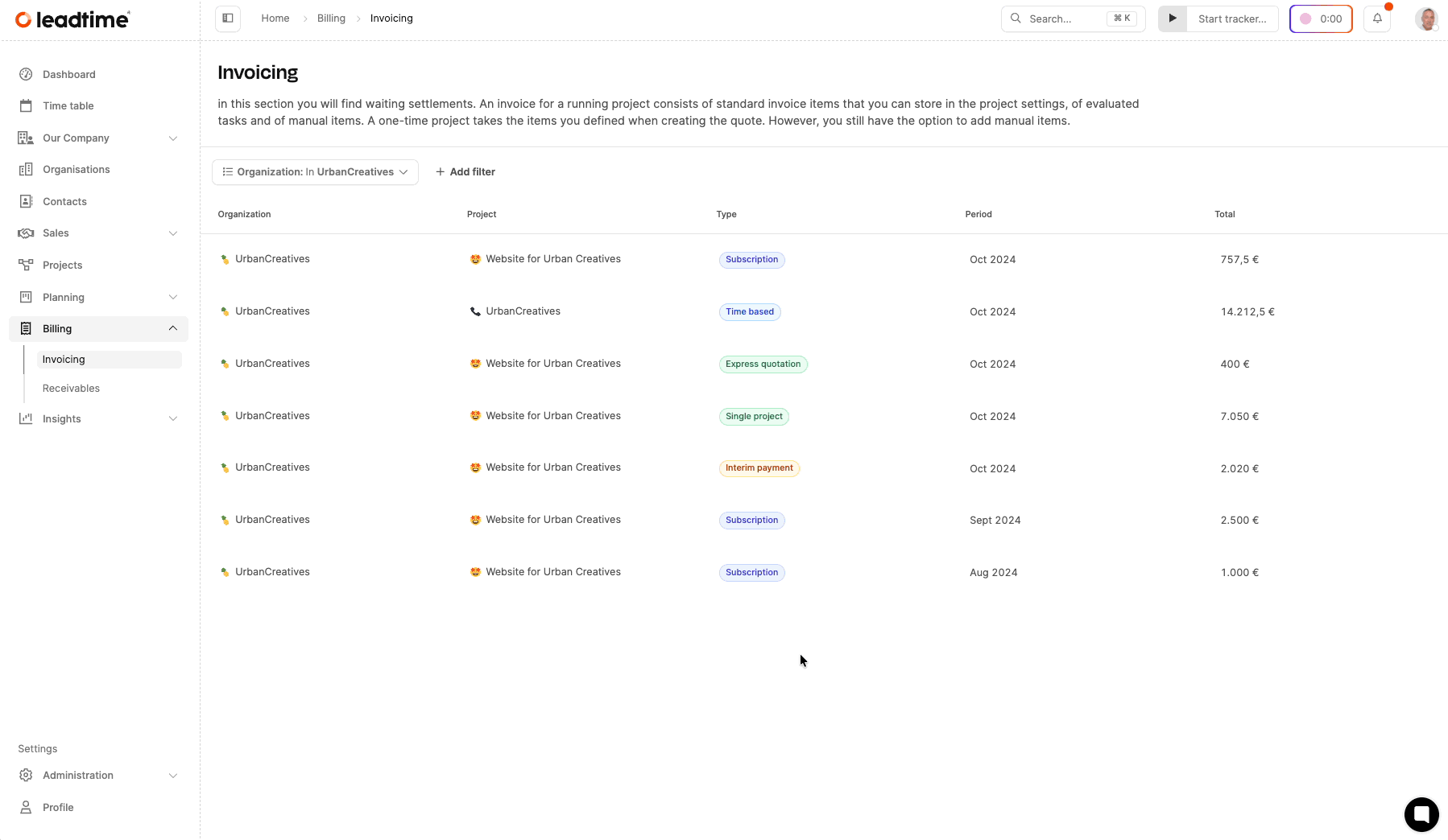 From the moment the project reaches the status “Billing”, Leadtime will automatically create product invoices at the frequency set in the project, until billing is deactivated or the project is closed.