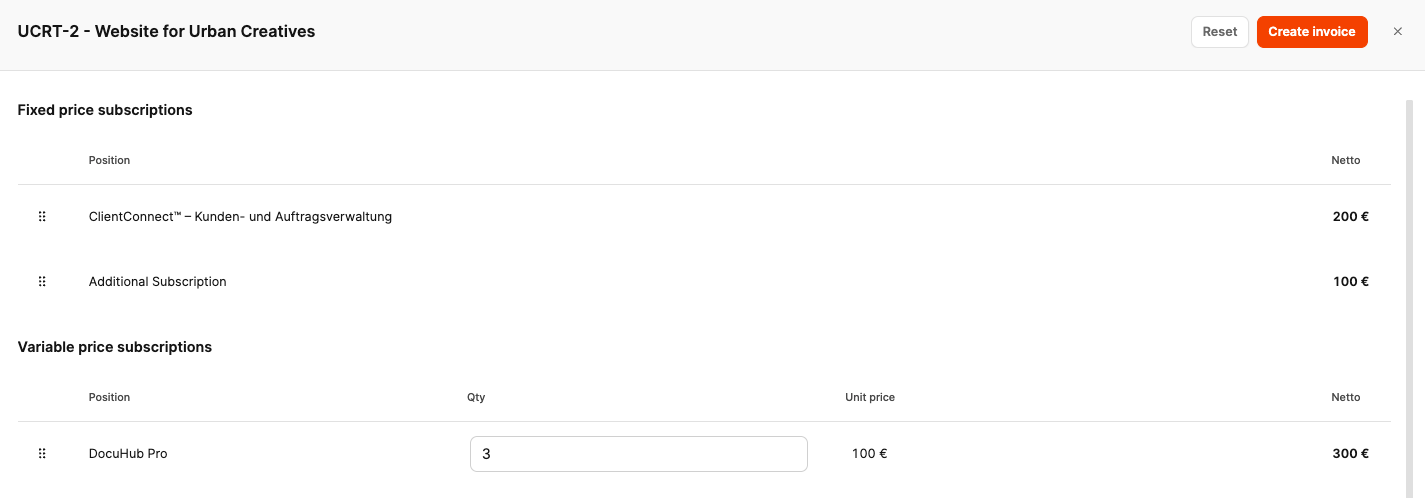 In a mixed project invoice, all these individual invoices come together in one very long collective invoice. However, we recommend splitting up the invoice to speed up payment processing: If the client has a question about one item in a mixed invoice, the payment for all other items is also delayed.