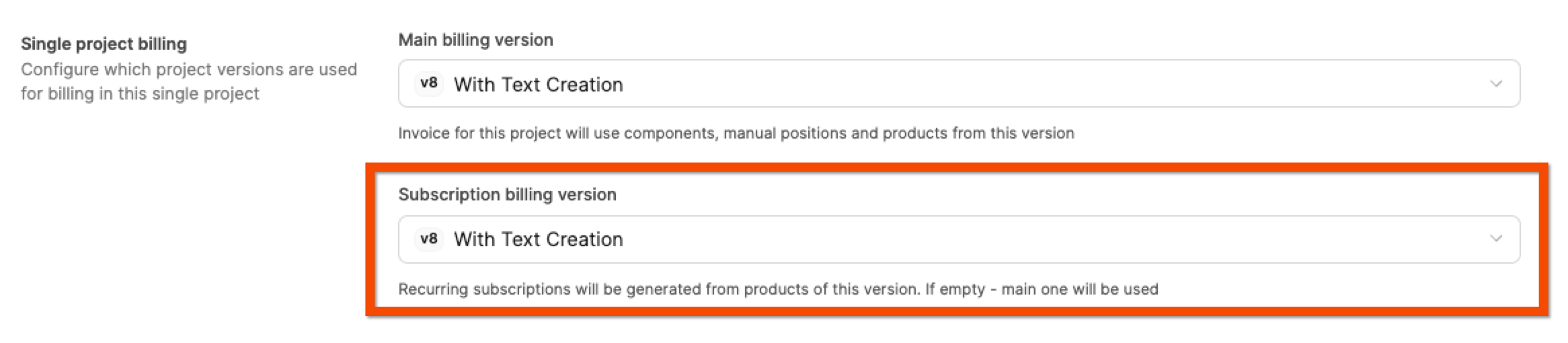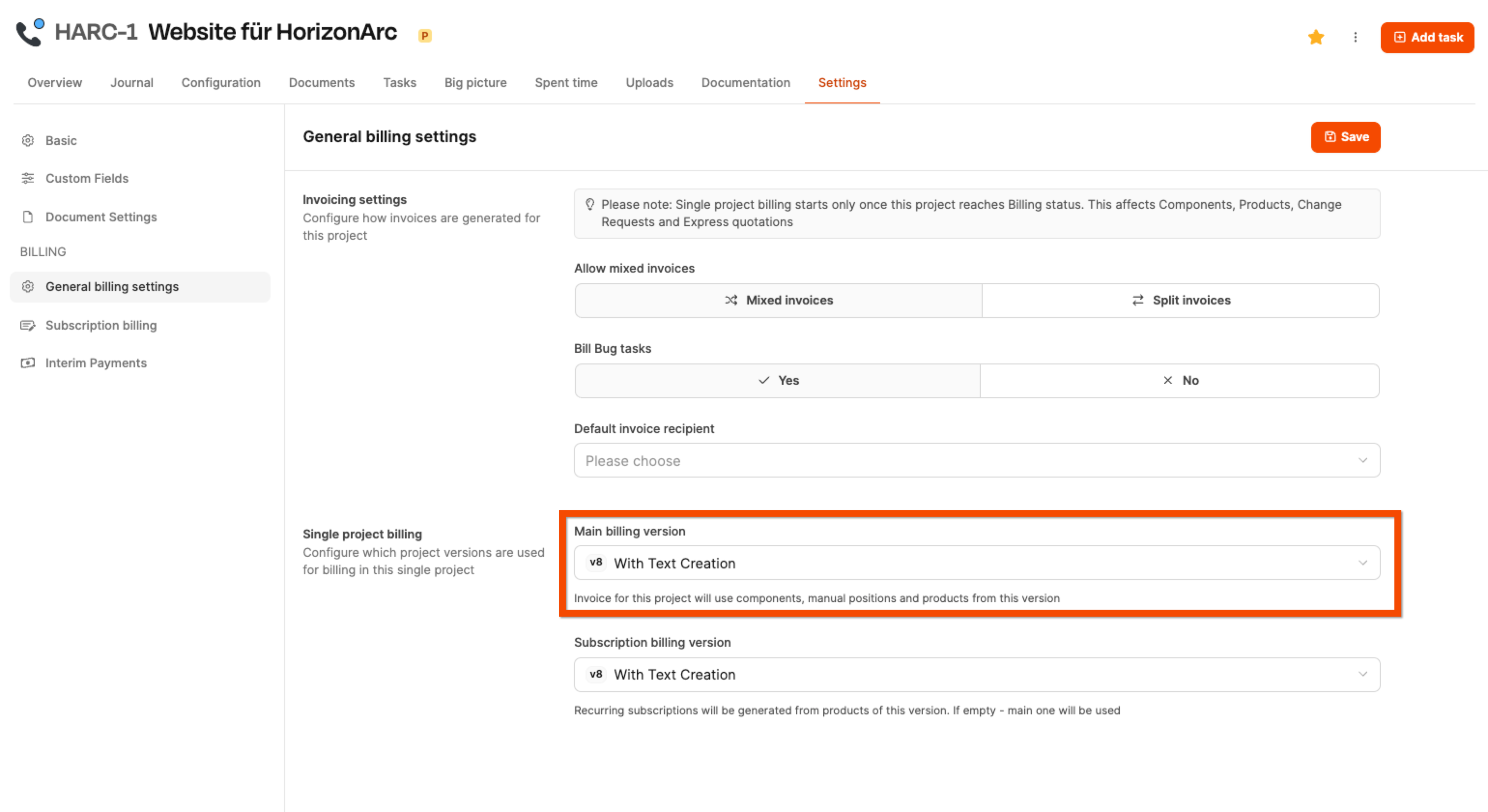 Since more products might have been added to the project after the original quote version was ordered, you can save separate versions of the project in the general billing settings for project billing and subscription billing.