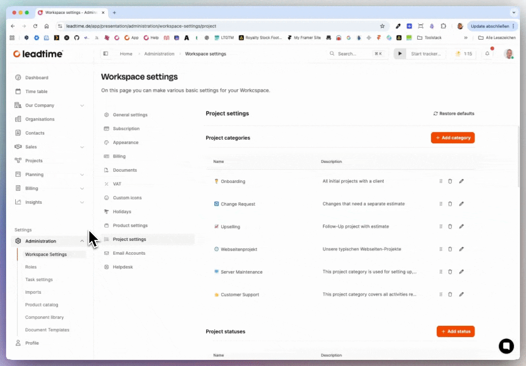 In the Project Settings section, you can adjust the structure of your projects. Here, you set up categories, phases, statuses, and custom fields that shape how your project organization works and looks in Leadtime.