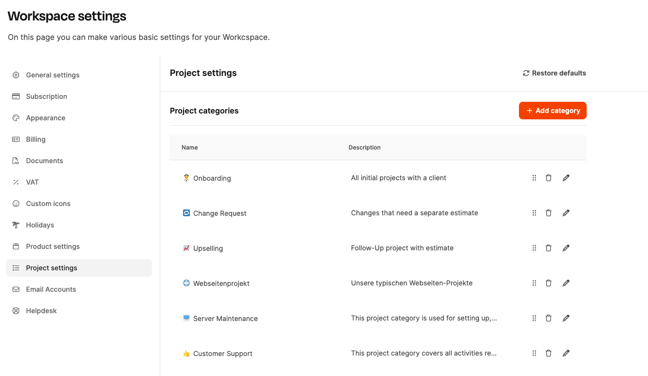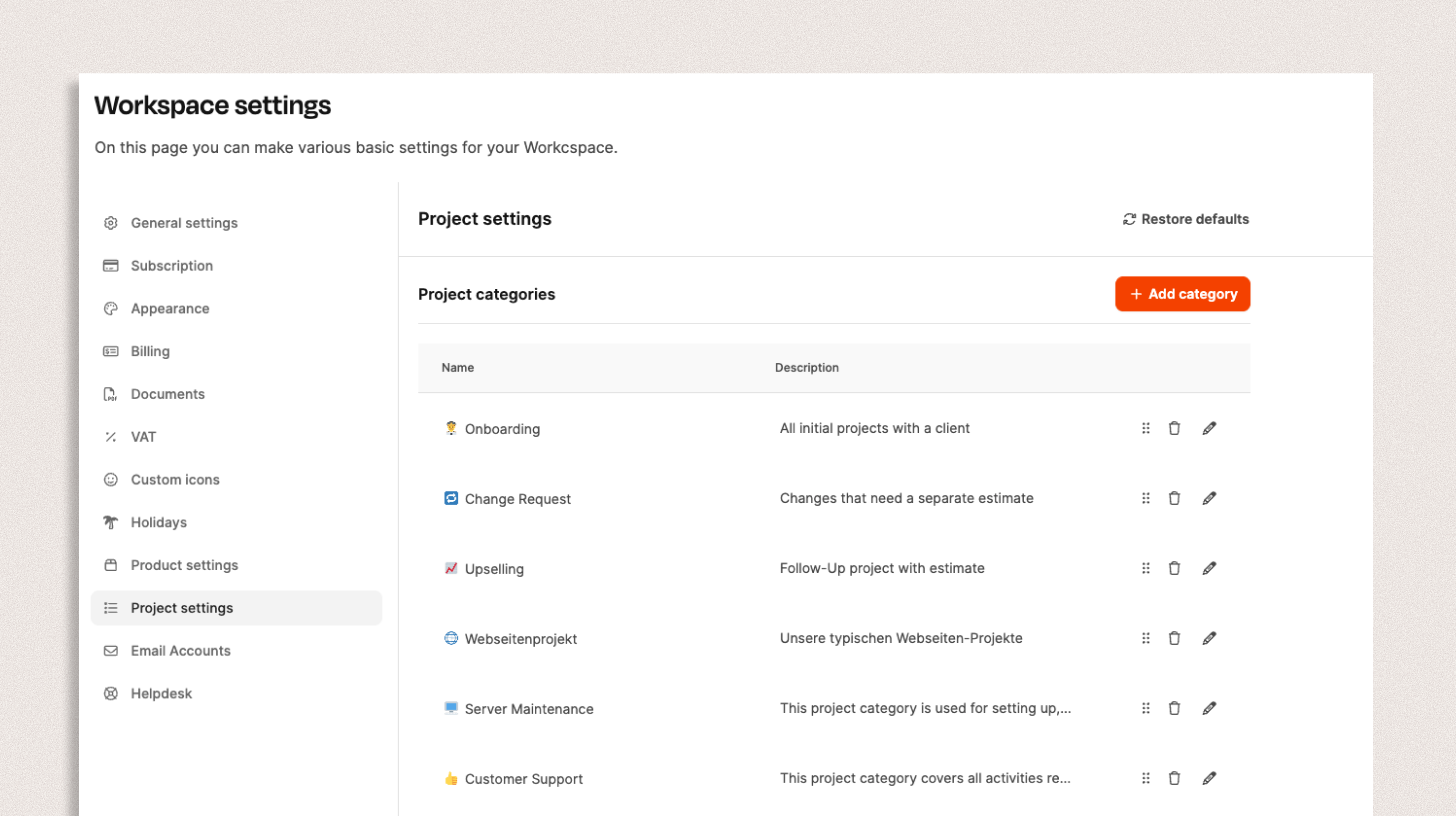 Project categories are used to sort your projects by type or purpose – like new client project, change request or service order. This kind of sorting makes it easier to analyze things, for example, how much revenue comes from existing clients compared to new ones.