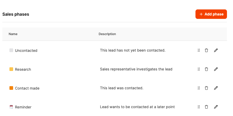 Sales phases (Sales Pipeline Stages) map out the steps a project or lead goes through in the sales process – from Not contacted to Closed.