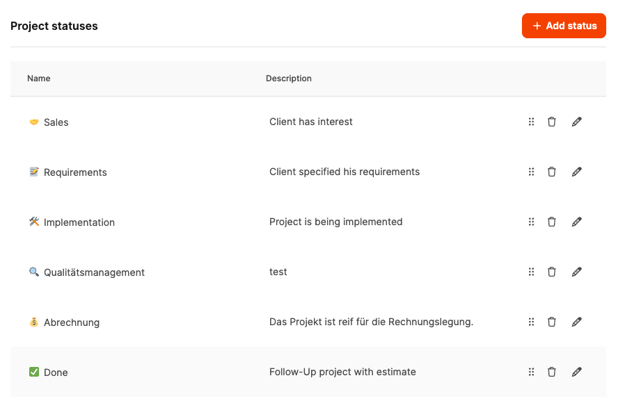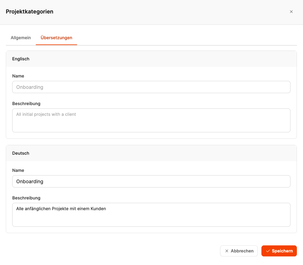 In the “Translations” tab, you can add labels and descriptions in multiple languages – for example, English and German. That way, project types, phases, and fields are shown in the right language automatically depending on the user interface language.