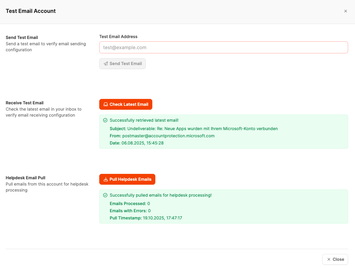 Once the account is active, you can use it to send, receive, or for automated Helpdesk mail import.
