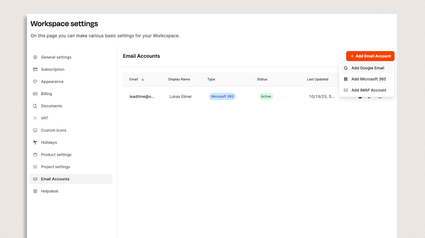 In the Email accounts section you set up the mailboxes that Leadtime can use to process helpdesk workflows. The system supports providers like Google Workspace, Microsoft 365 and standard IMAP mailboxes.