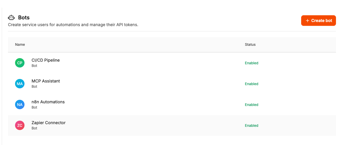 AI assistants / MCP: Let an AI coding assistant (e.g. Cursor with MCP) read and write tasks and projects on behalf of the bot rather than a personal account.