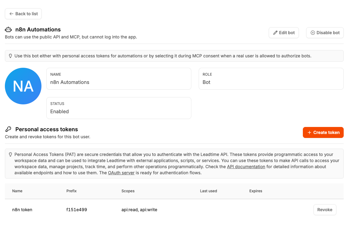 Each bot can have one or more personal access tokens. Tokens are used as Authorization: Bearer <token> when calling the Leadtime Public API.