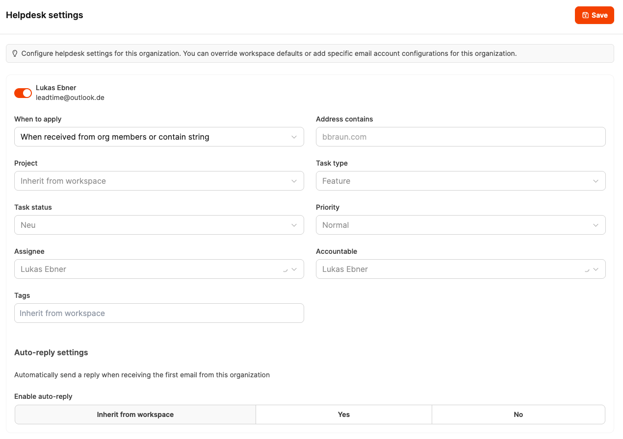 That means: You can set up your own helpdesk rules and inboxes for specific customers or partners — completely independent from your workspace's default config.