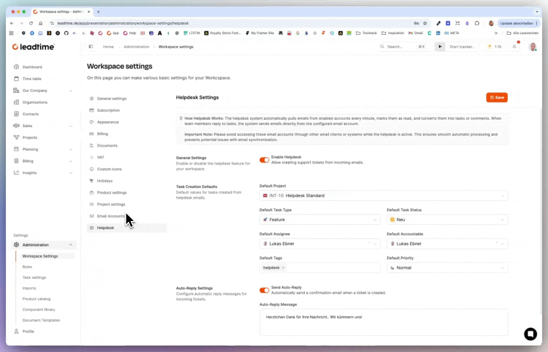 The Helpdesk area in Leadtime lets you automatically turn incoming emails into support tickets. The system regularly fetches messages from connected email accounts, turns them into tasks, and assigns them to a project, type, status, and responsible person. Replies from Leadtime are sent straight from the linked inbox.