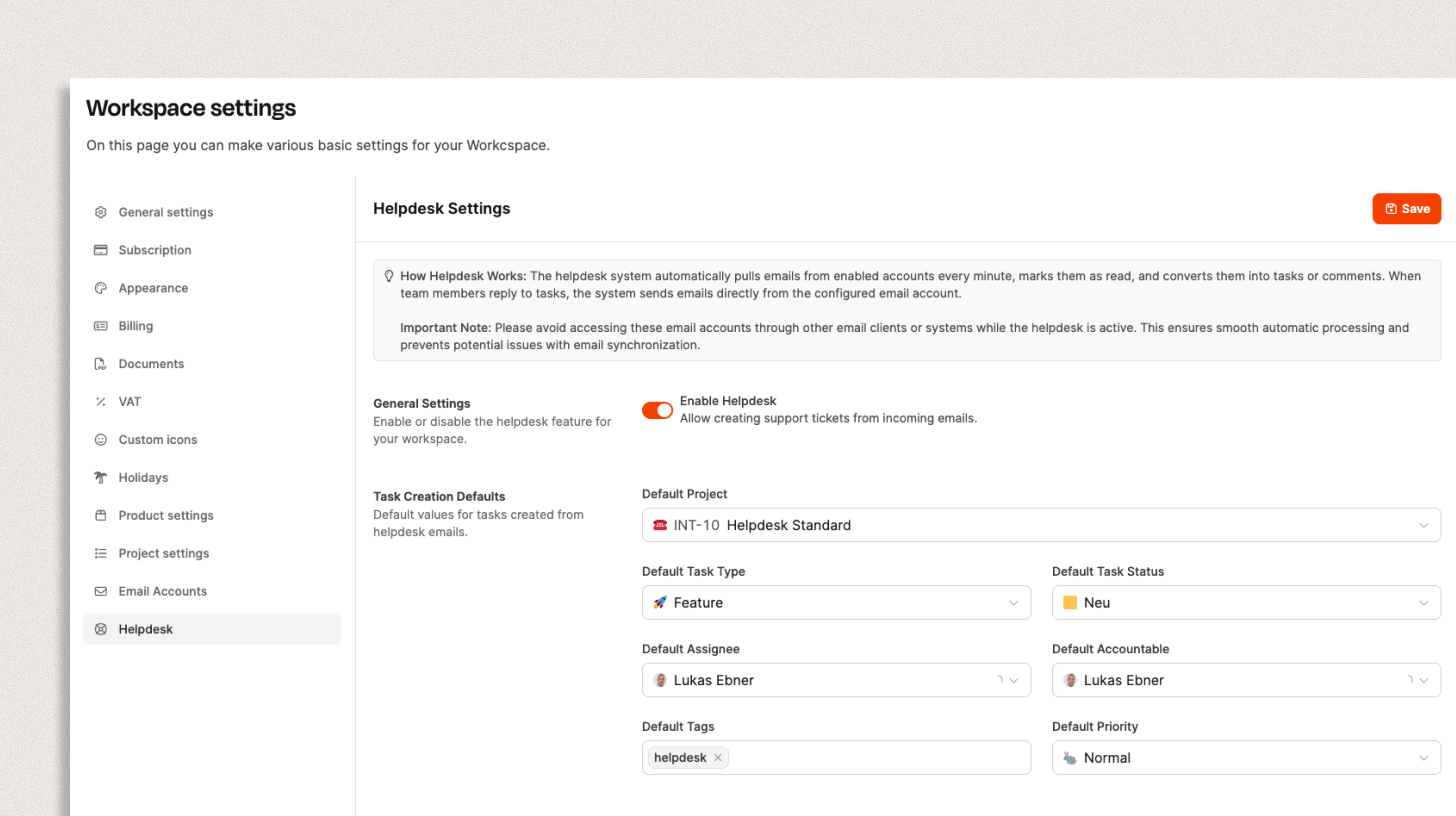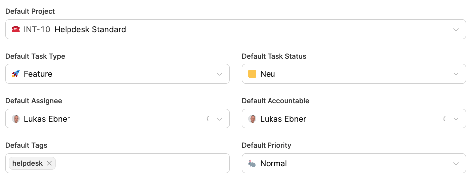 Default task type: Sets which task type new tickets will get by default (e.g. Feature, Bug, Support request).