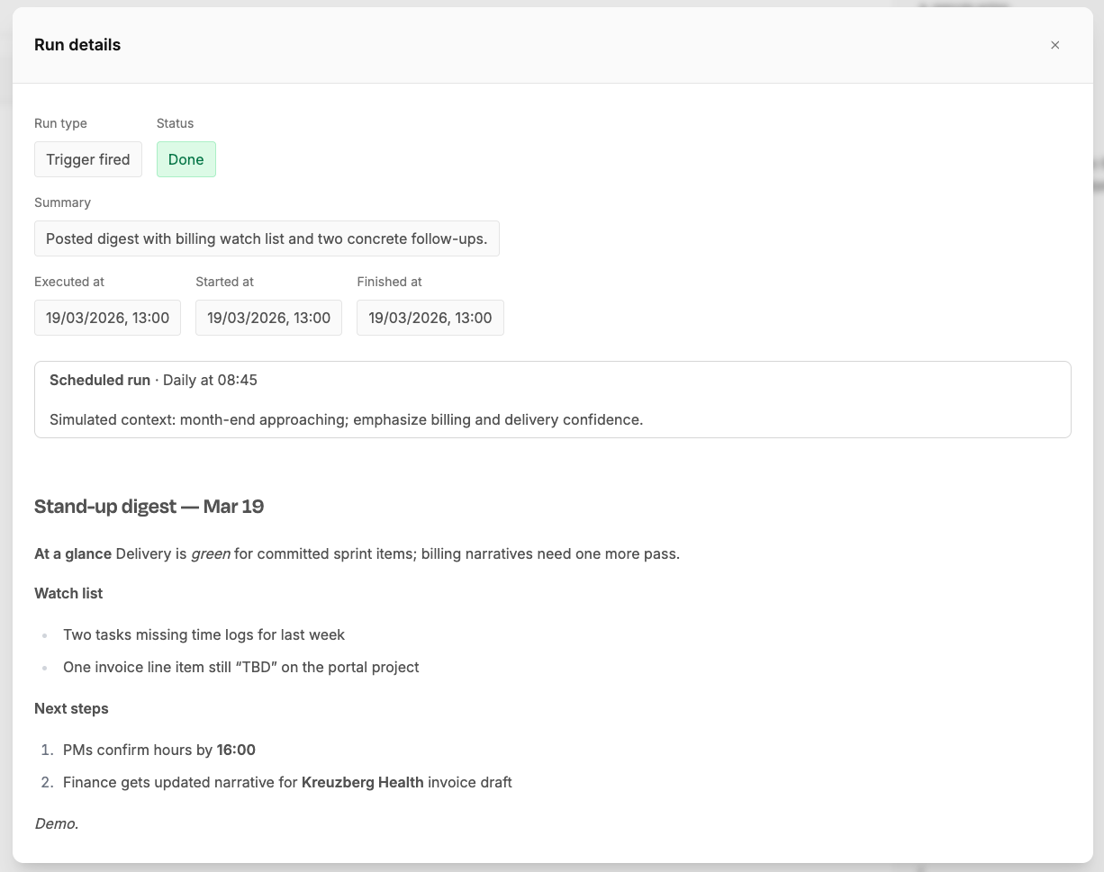 Daily standup digest — every morning at 08:45, the agent reviews open tasks and posts a summary with priorities, blockers, and risks to your team channel.