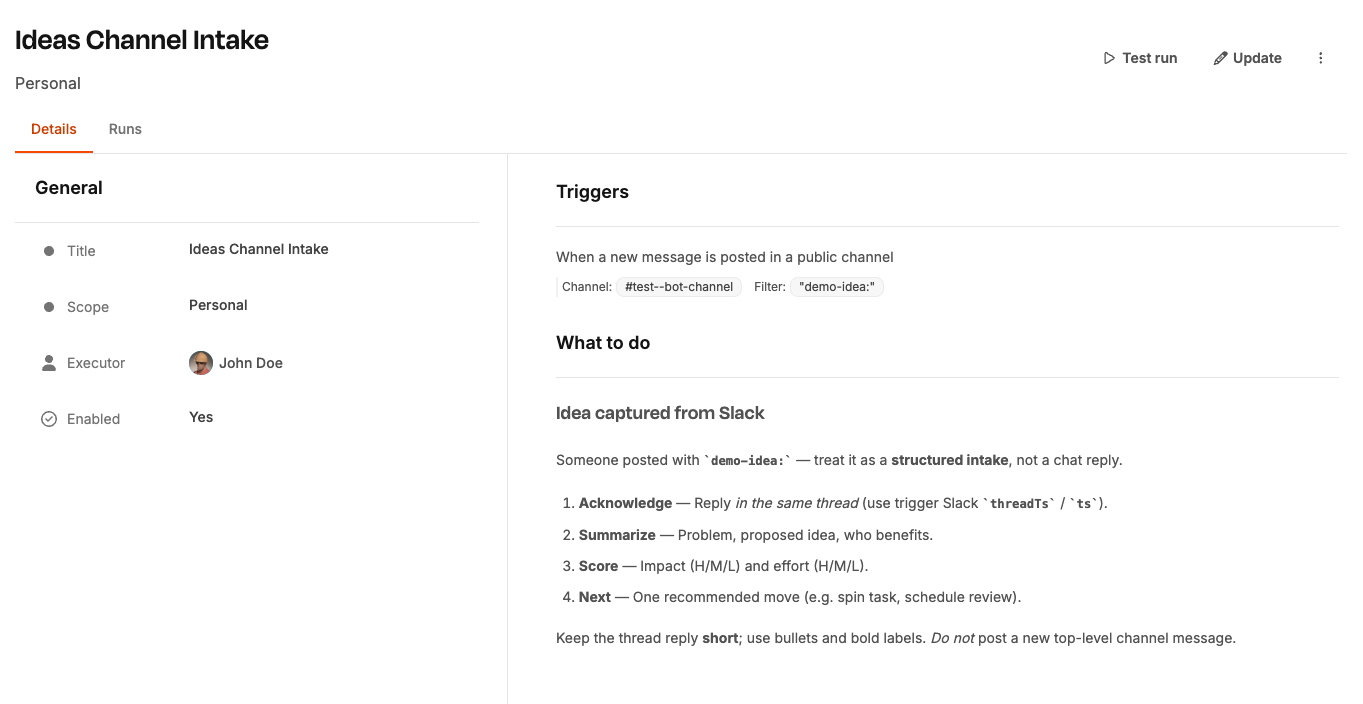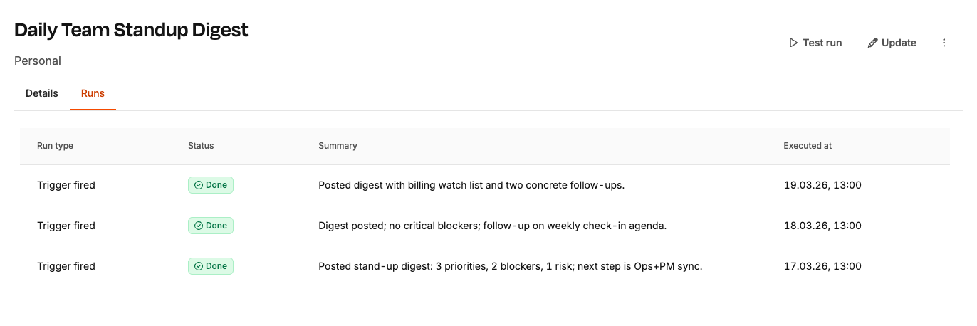 You can also trigger a run manually with Test run — useful when writing a new prompt and iterating on the output.