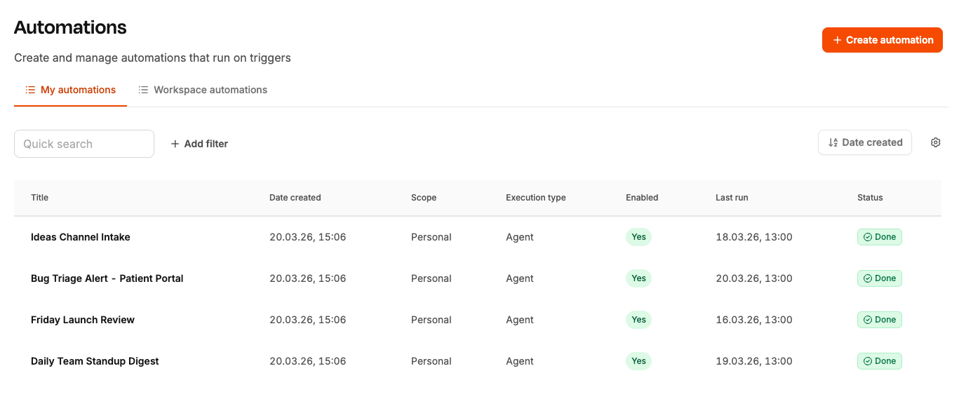 Manage workspace automations — create and run shared automations visible to the whole workspace. Available to Team Lead and CEO roles.