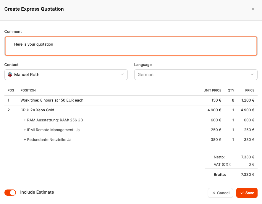 Example: A customer orders a setup for a software solution. The quote includes both the work time for setup (project service) and the software product itself (from the product catalog).
