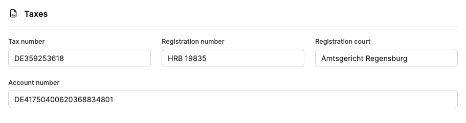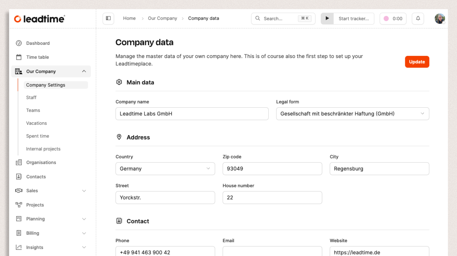 Here’s where you manage the core master data of your own company – meaning all the legal, administrative, and contact details that get used automatically in other parts of the app, like invoices, contracts, or projects.