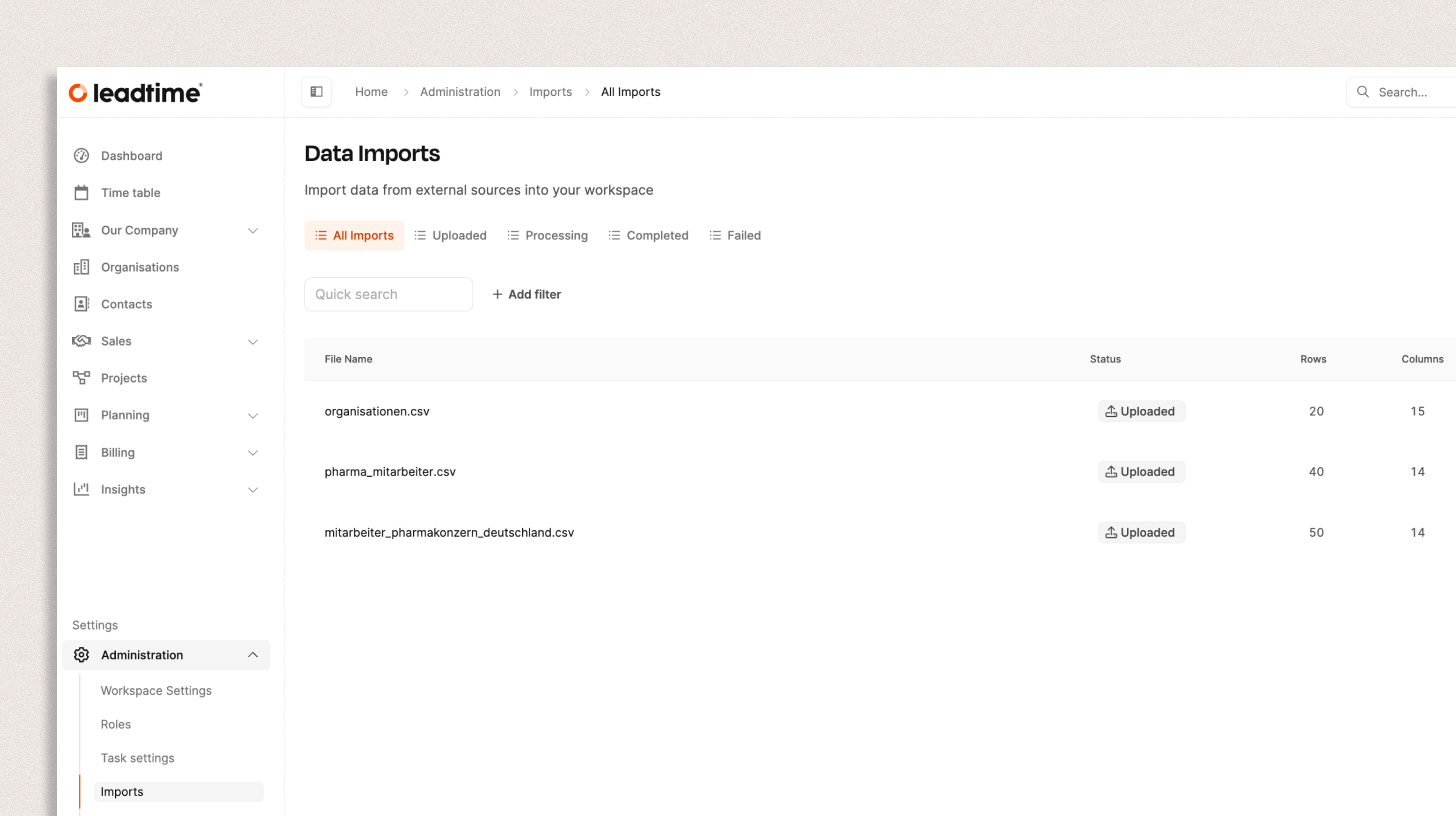 The Data Imports section is under Administration → Data Imports and is used to import data from external sources such as CRM, HR, or ERP systems into Leadtime. With this function, you can create or update records in bulk – like employees, organizations, projects, or tasks.