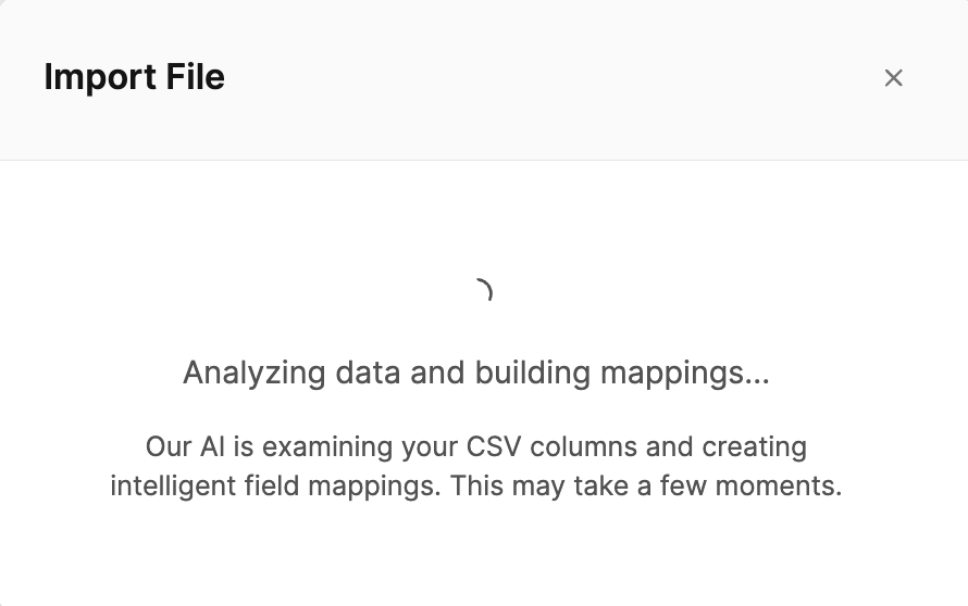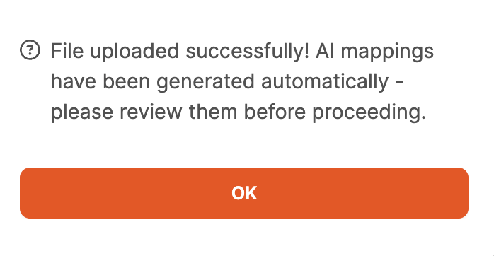 Next you'll see a notification: “File uploaded successfully! AI mappings have been generated automatically – please review them before proceeding.”