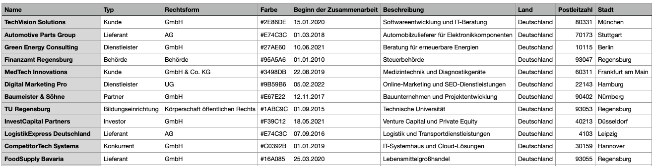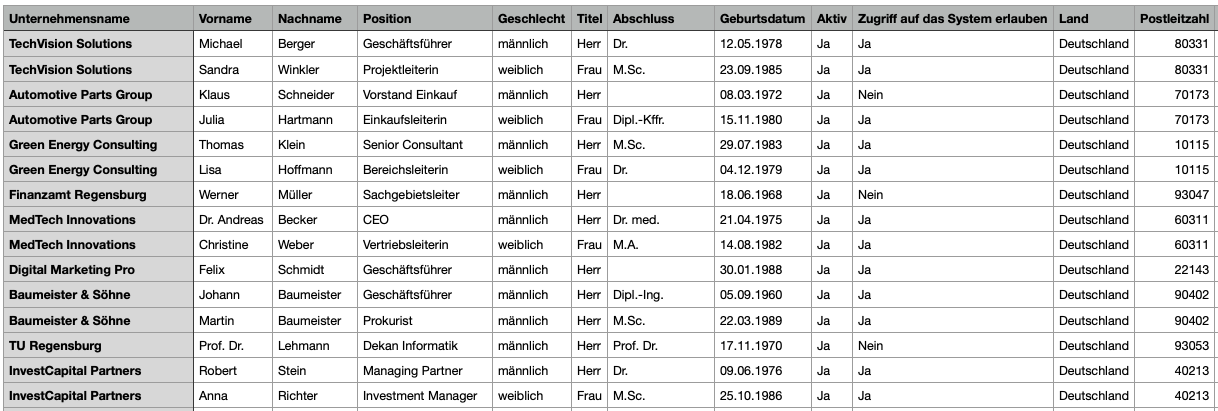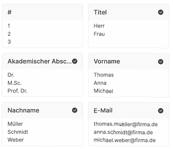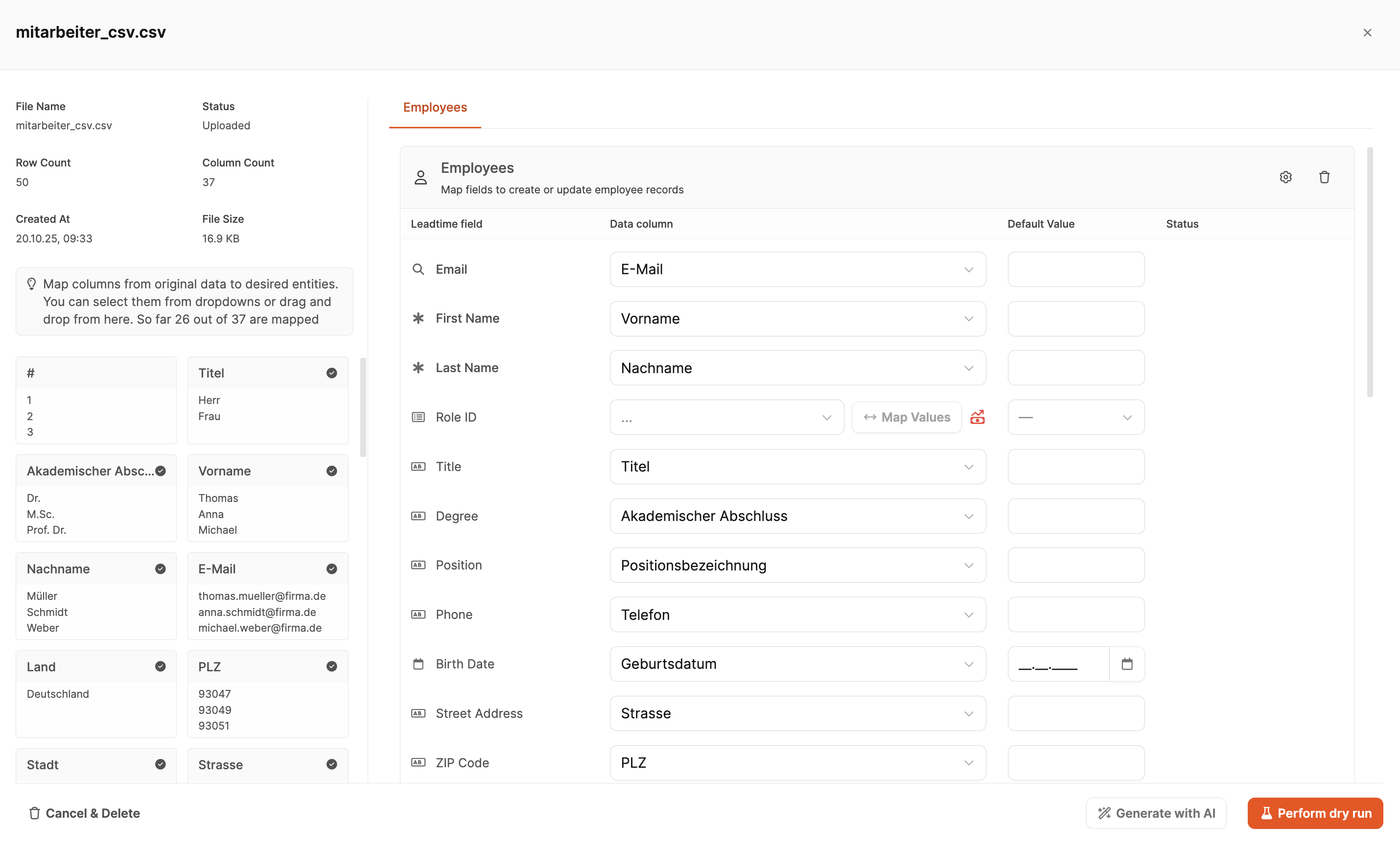 Leadtime recognizes the column headers of your CSV file and assigns them to matching fields in the system (e.g. Vorname → First Name).