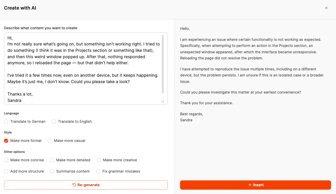 It thinks along with you, structures automatically and adapts to your style—whether you’re documenting tickets, drafting project templates or creating product descriptions.