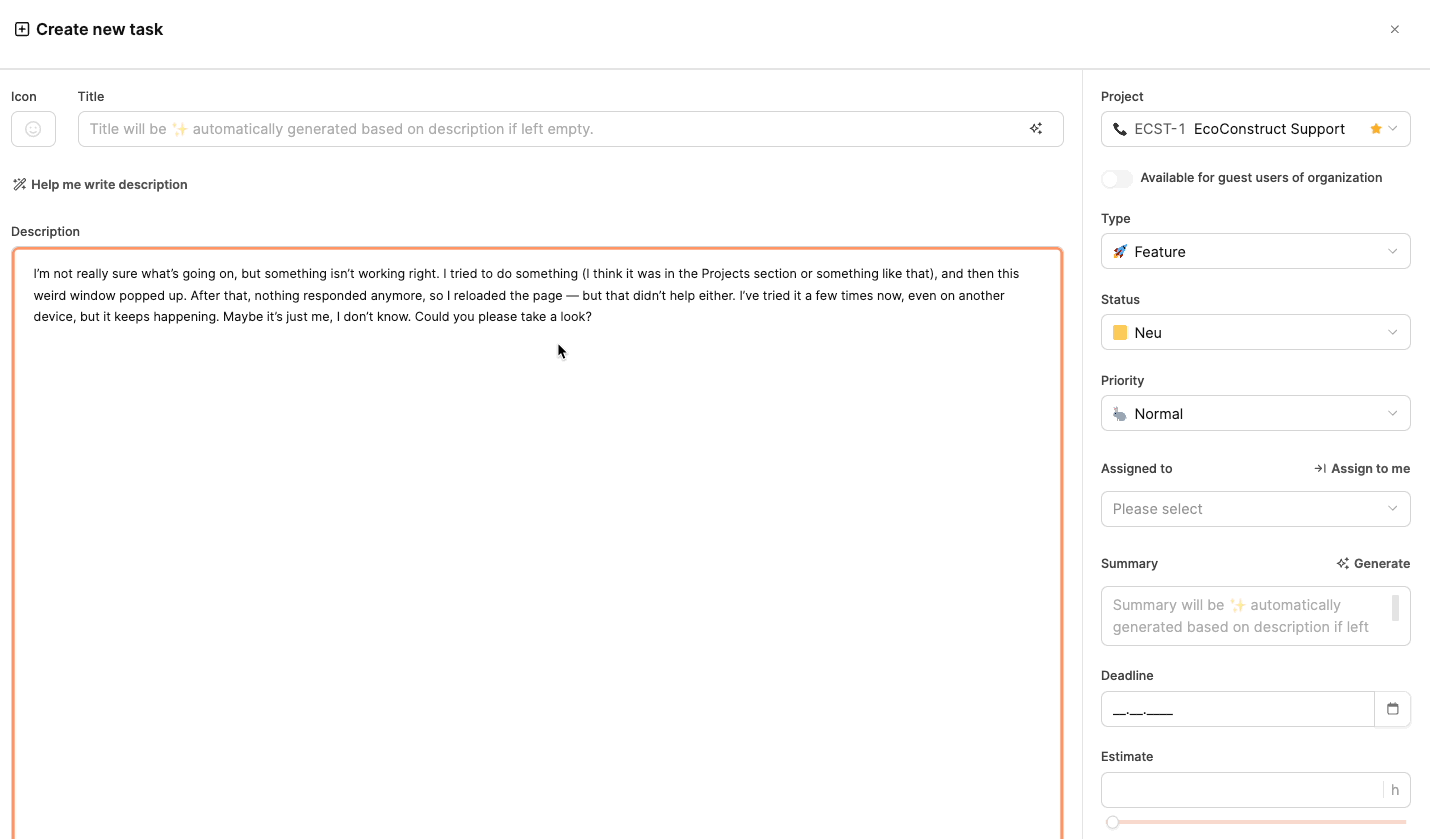 The Leadtime AI Text Assistant is your smart writing assistant right in the editor – everywhere you create or edit text in Leadtime. It helps you write content faster, make your writing clearer, and automatically adjust your writing style – from technical tickets to project documentation.