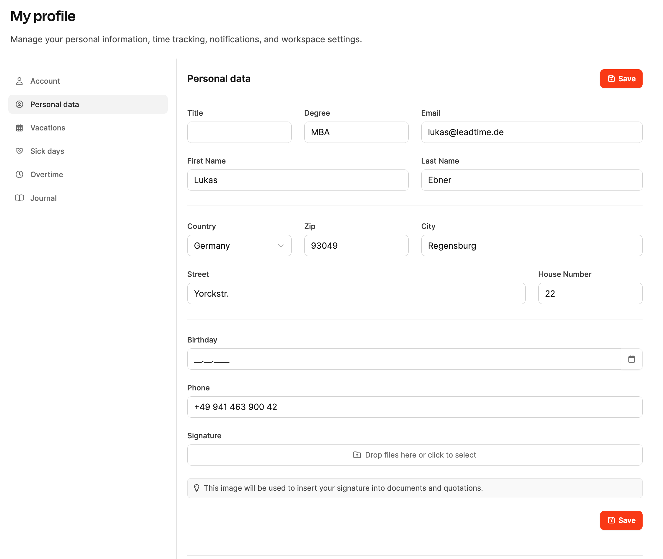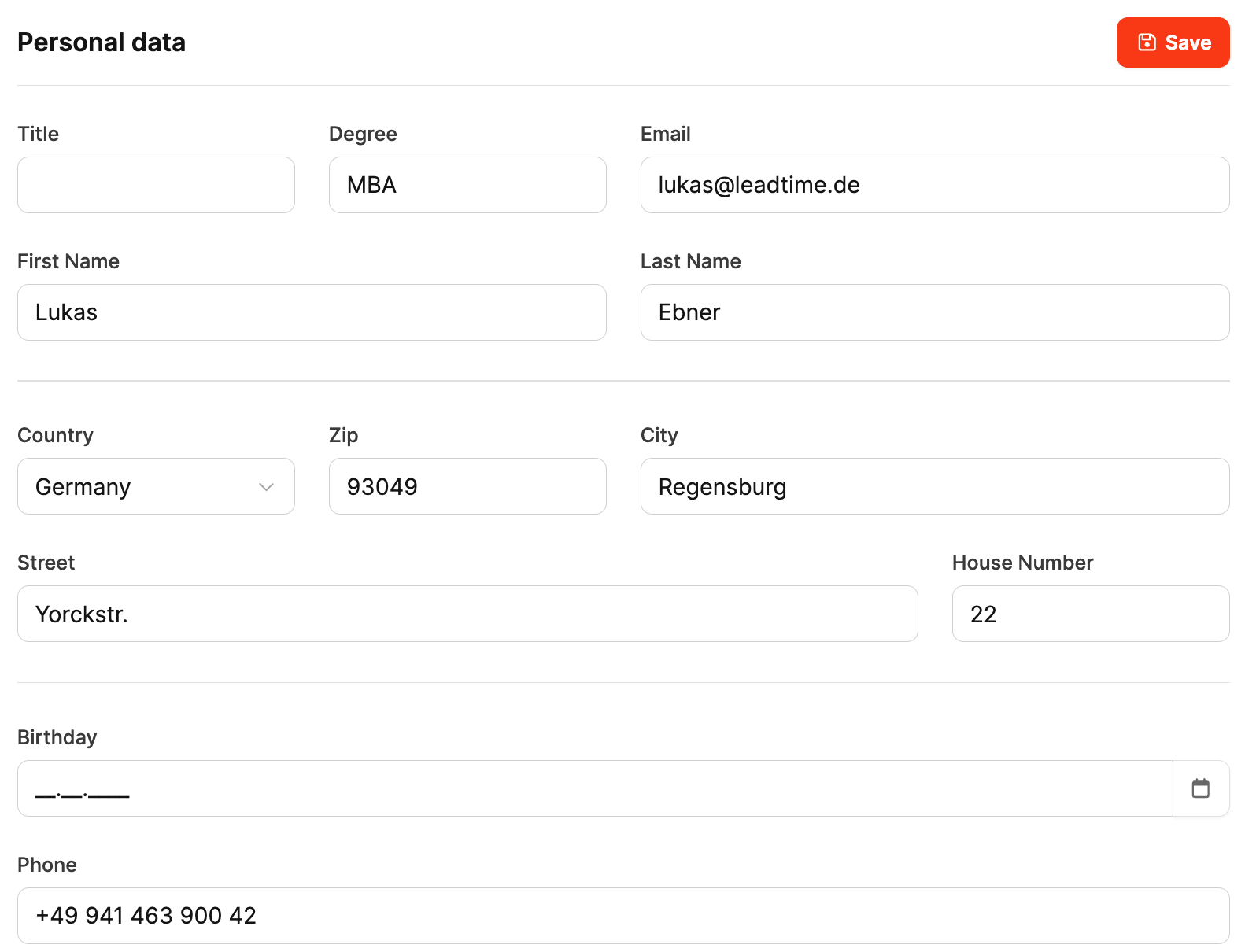In the tab My Profile → Personal Data you’ll find all the important fields about you and your contact info in a clear entry form.