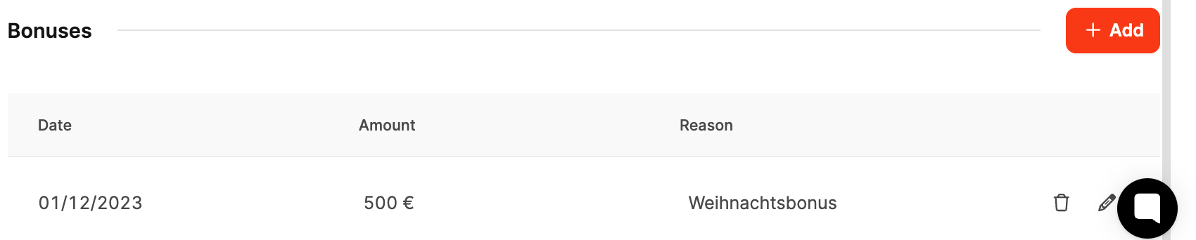Add bonus: With the “Add” button, you can enter the date, amount and reason.