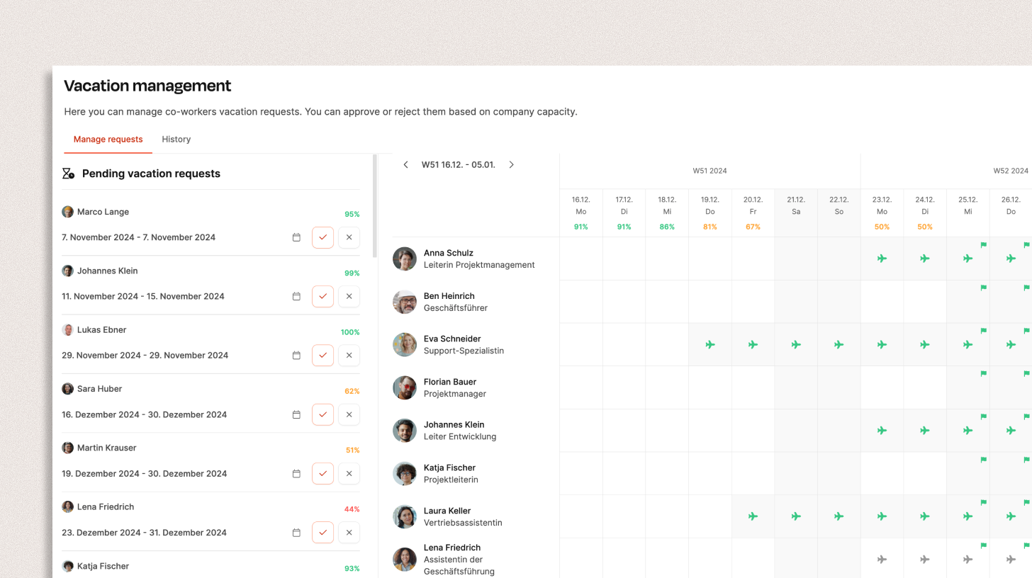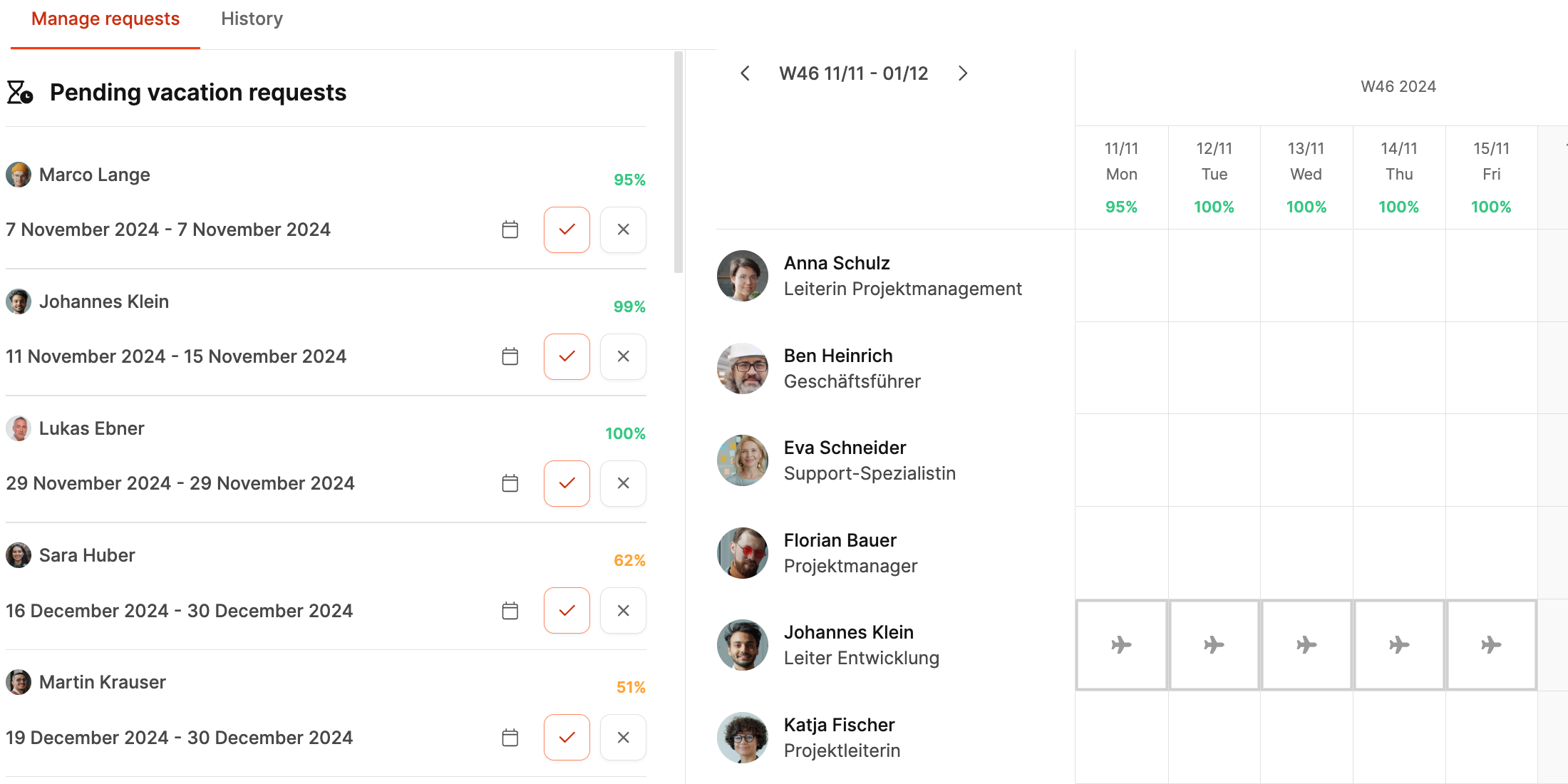 Pending leave requests: All open requests showing the capacity utilization in percent.