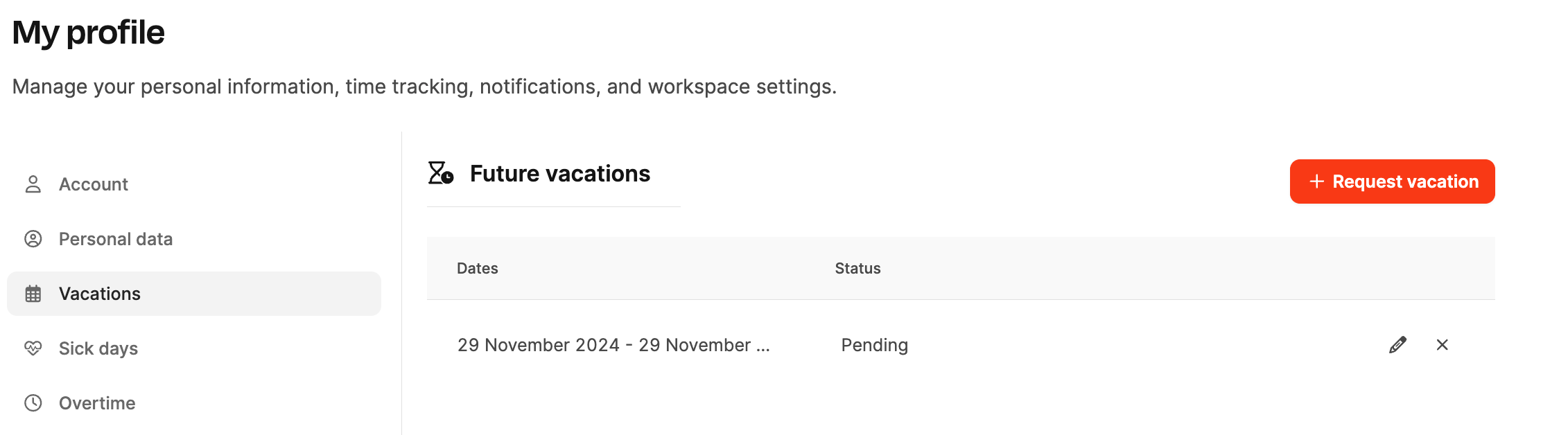 The section My Profile → Vacation lets managers review, approve, or reject vacation requests. The goal is a transparent, efficient approval process with a clear overview of capacity, workload, and history.