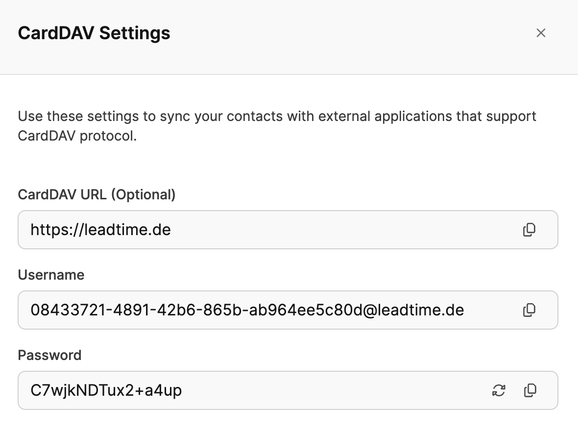 Using the “Sync via CardDAV” button, you can sync the address book with external apps that support the CardDAV protocol (like Apple Contacts, iOS, Thunderbird).