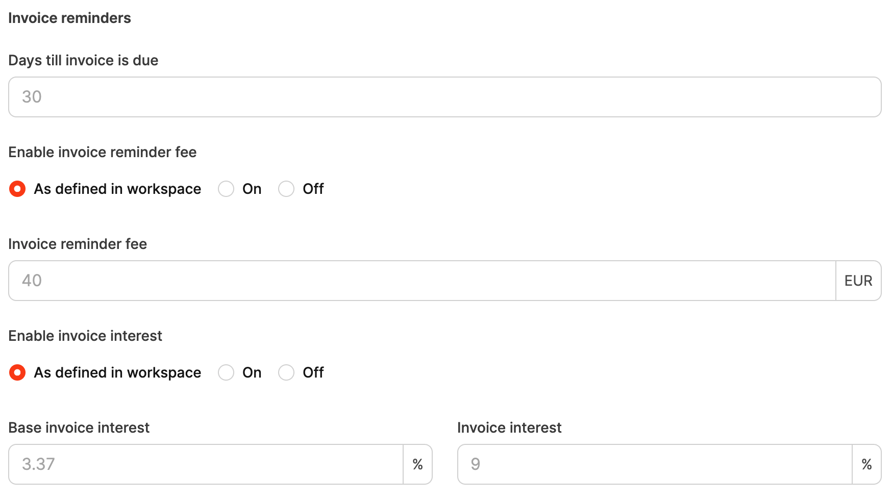 In the Invoice Settings section, you define organization-specific billing parameters that determine how invoices, reminders, and cancellations are created for a particular organization. These settings can override the general workspace rules to allow customer-specific payment terms and texts.