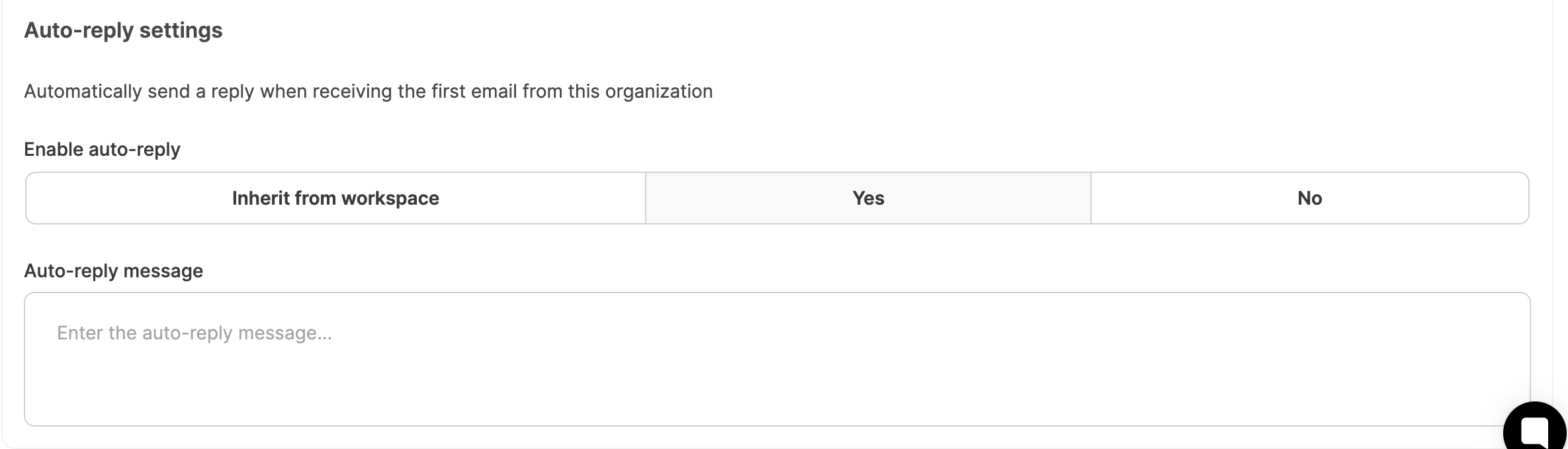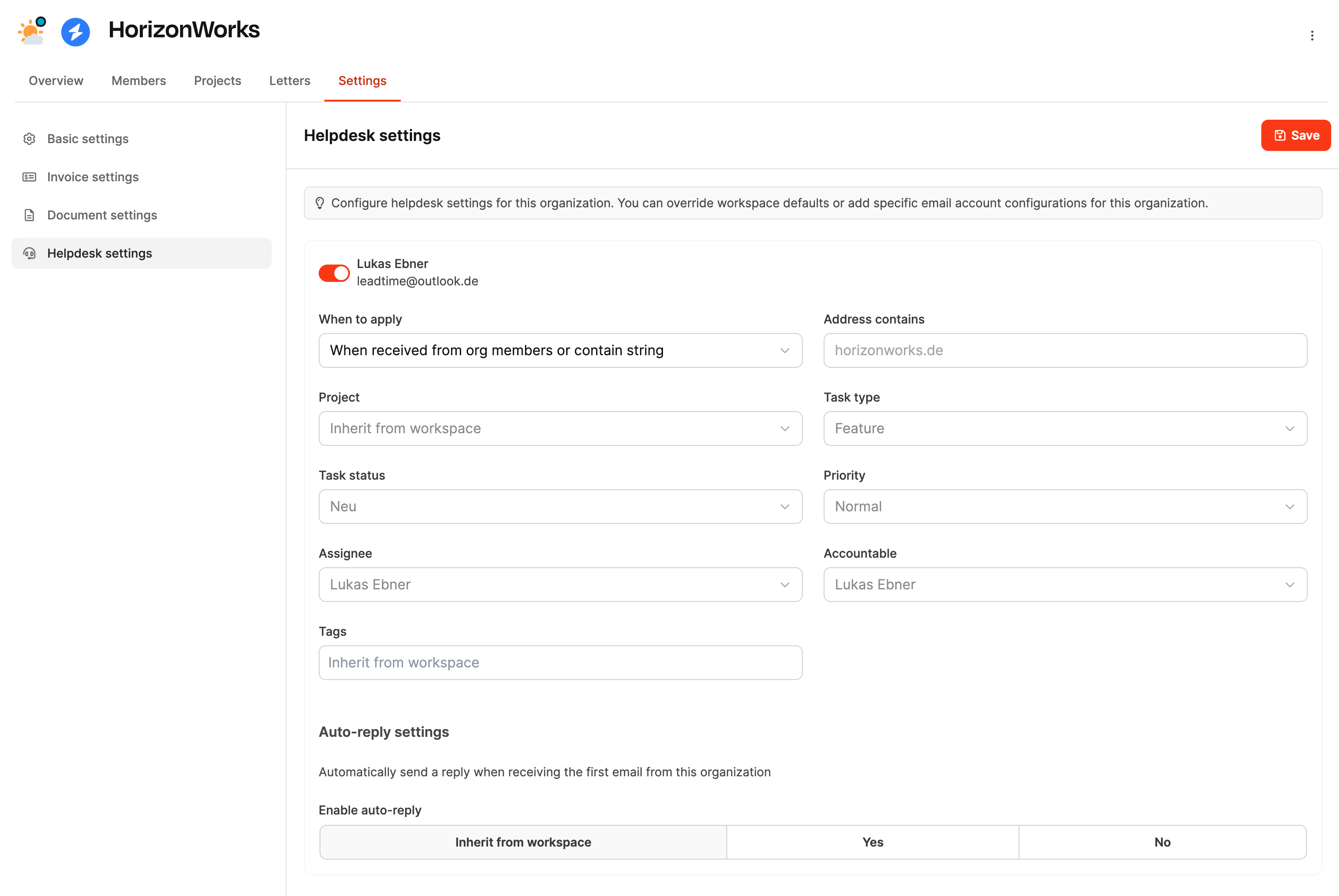 In the Settings → Helpdesk Settings area within an organization, you can define how incoming support emails for this organization are handled. The settings allow individual control of ticket behavior, independent from the workspace’s global helpdesk defaults.