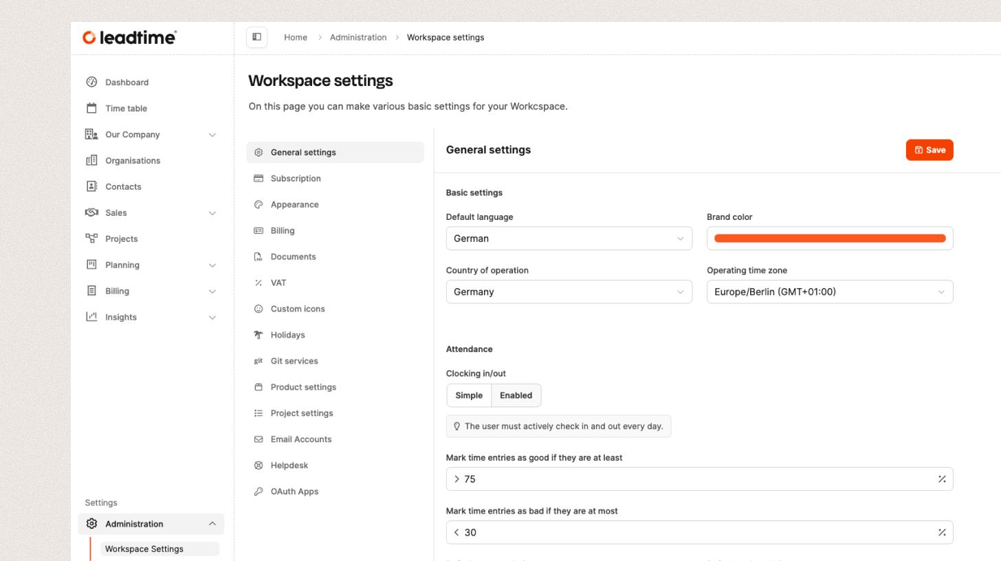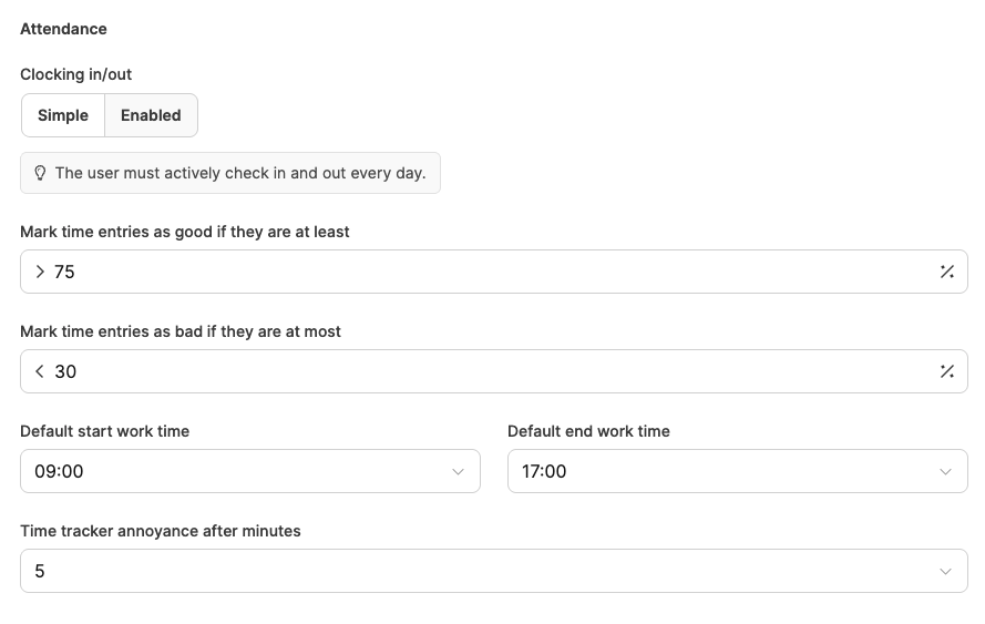 Thresholds: Set when a time entry is considered 'good' or 'bad' by percentage. These values affect color coding on the team calendar.