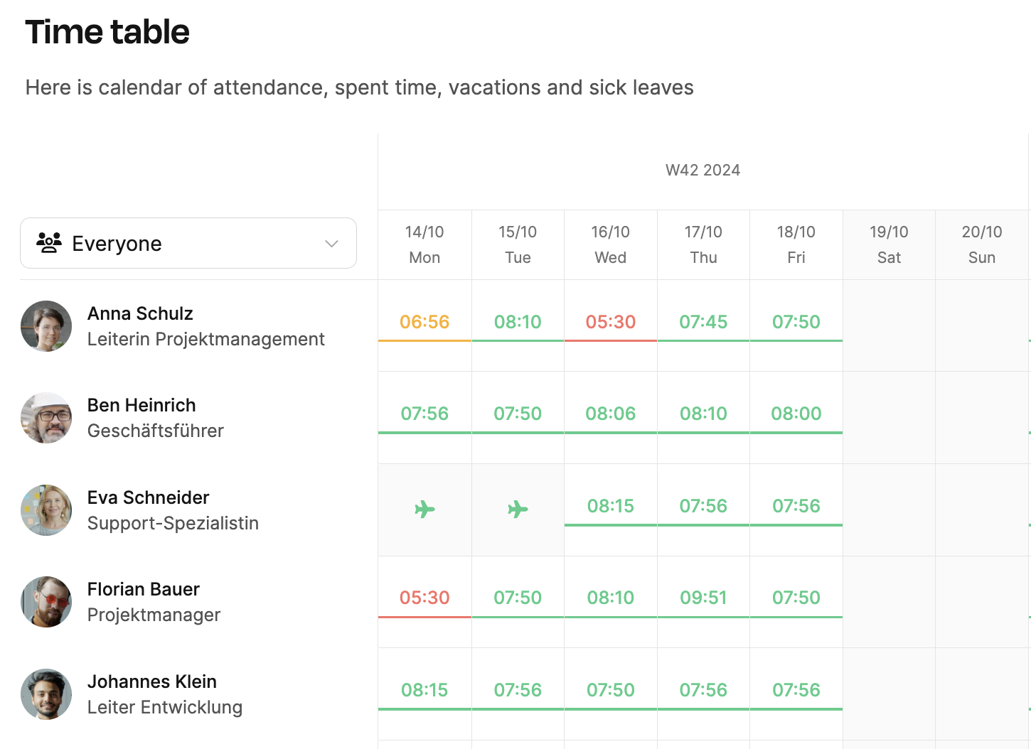 This visual overview lets managers quickly spot who regularly works too little or doesn't clock in and out fully. At the same time, employees themselves can see how their behavior comes across in the team – which helps with motivation and a sense of responsibility.