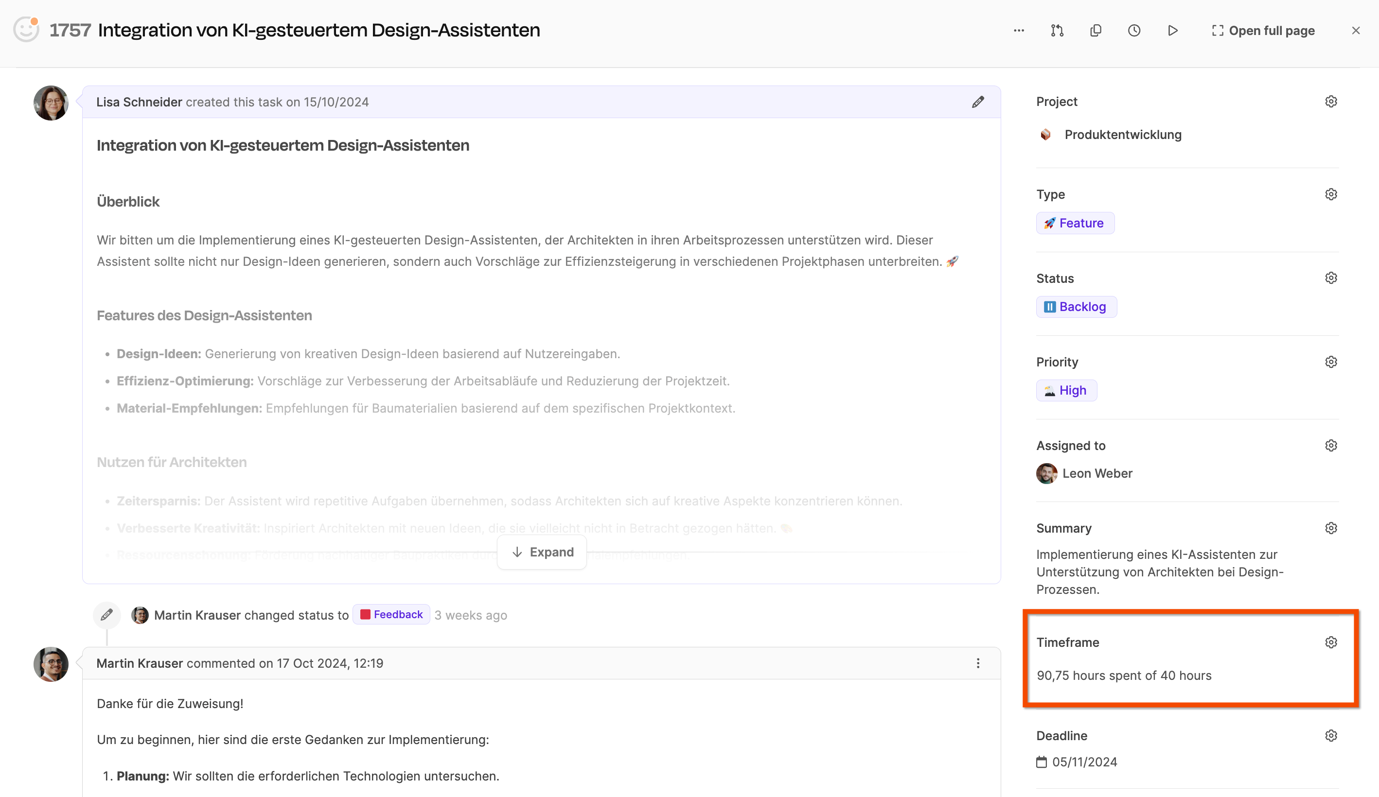 In lots of projects, several people work on the same ticket one after another—like for development, testing, or management. Each person logs their hours on the ticket, which makes the total effort add up automatically. Leadtime compares this booked time with the original plan so you can instantly see when a ticket goes off track.