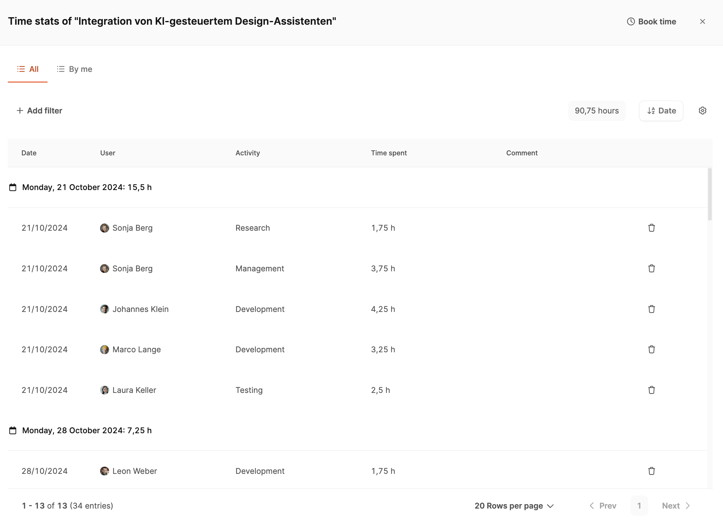 Here, you can see all the team members' individual bookings – including date, activity, time spent, and comments.