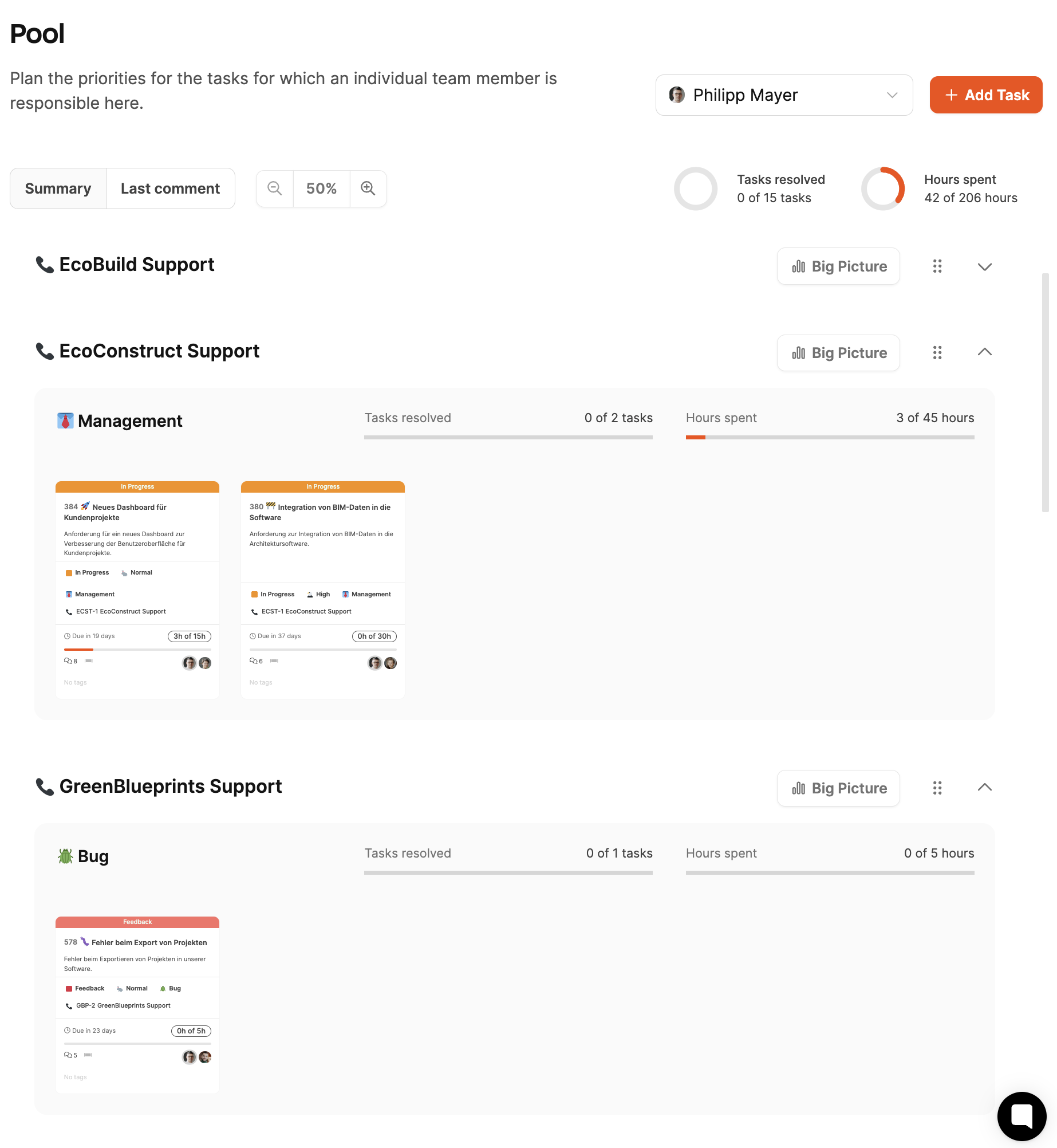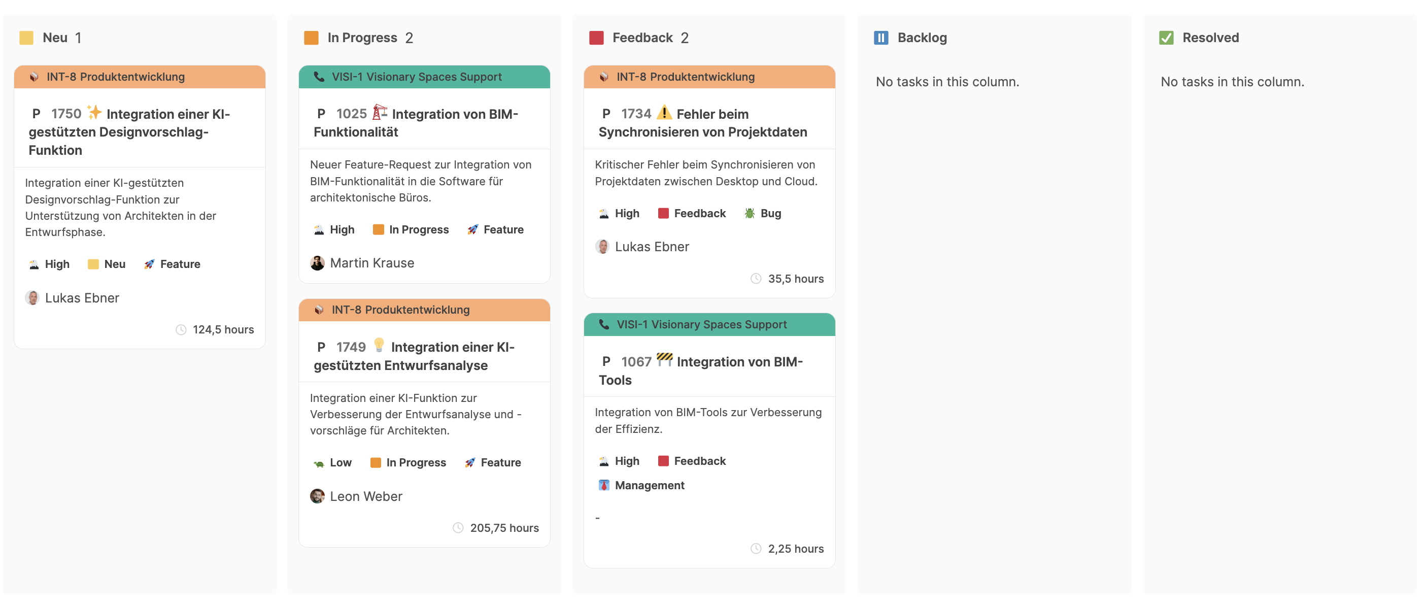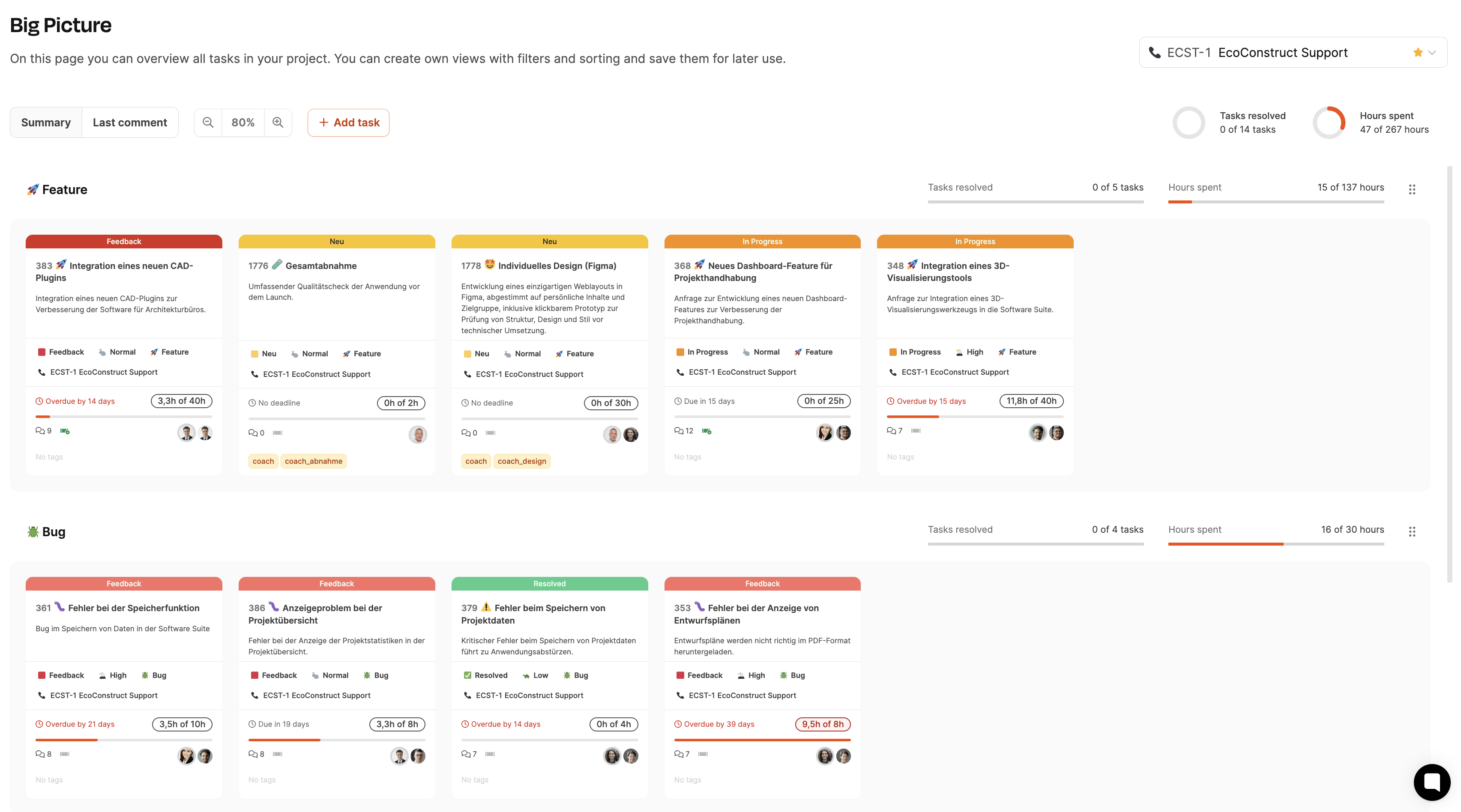 The Big Picture tool is the first step in the planning chain and is used for the project overview at the level of individual customers. It shows all tasks of a project as visually organized cards, which are divided by task types, like for example features and bugs, for example. Within these categories, tasks can be prioritized based on importance.