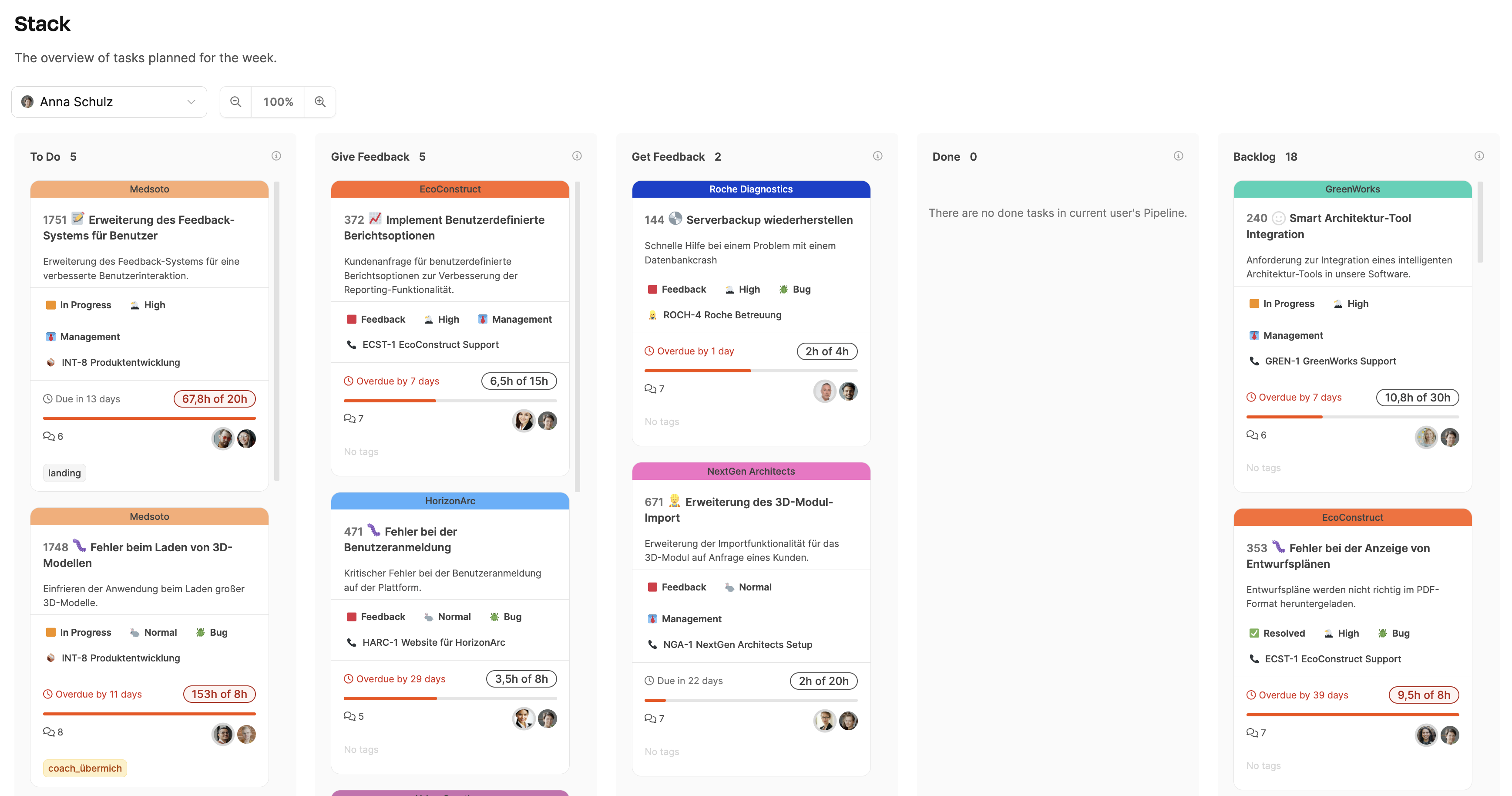 Example: A developer sees all their assigned tasks in the “To do” column of their Stack at the start of the week. They work through the tasks one after another. If they run into an issue or need feedback, they can move the ticket to the “Request feedback” column and assign it to the responsible colleague. This will pause the progress on the task and they can focus on the next one.
