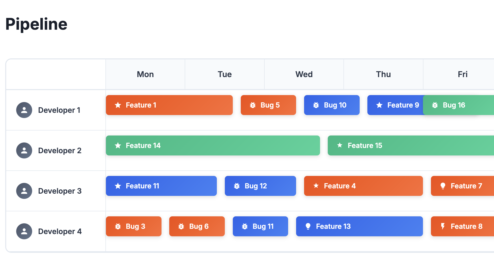 The pipeline plan is used for the weekly assignment of tasks to team members, mostly developers or specialized experts. It's all about using the team members' capacities efficiently and setting a smart order for getting stuff done. The pipeline spreads the tasks out across projects and clients for the week and shows how much working time each developer has available.