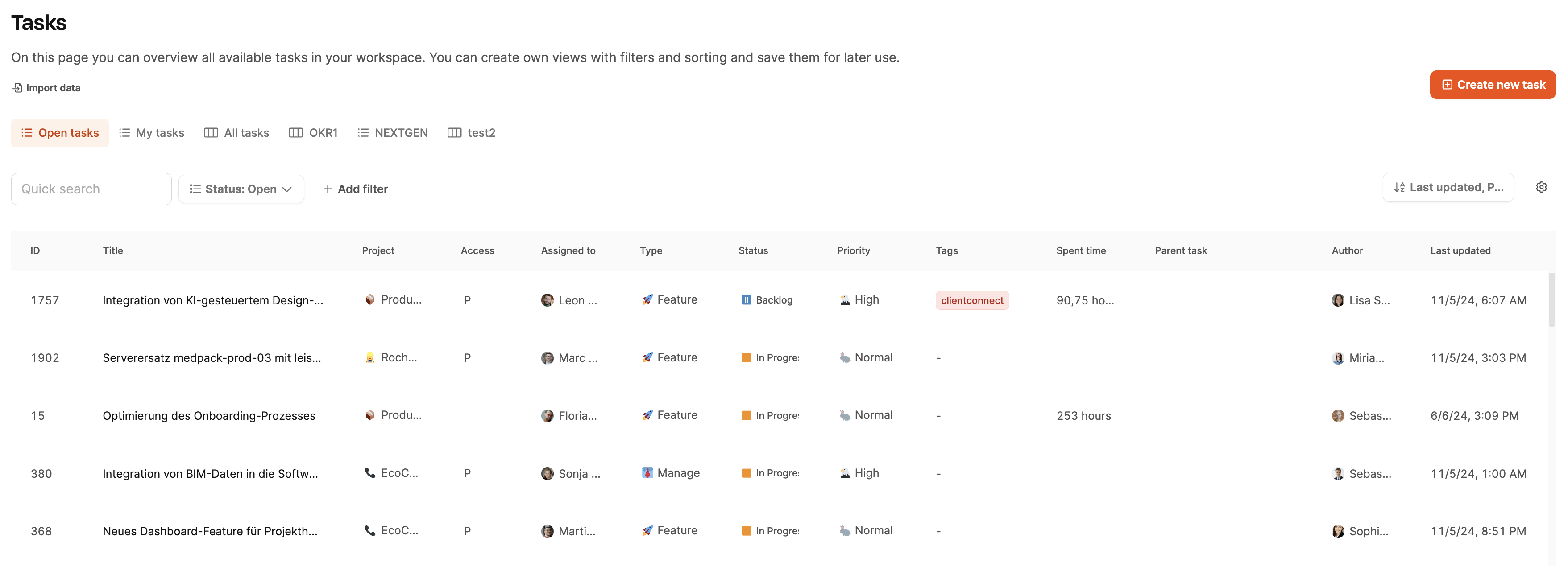 The list view under Planning → All Tasks gives you a central overview of all tickets in the system – no matter which project, customer, or assignee.