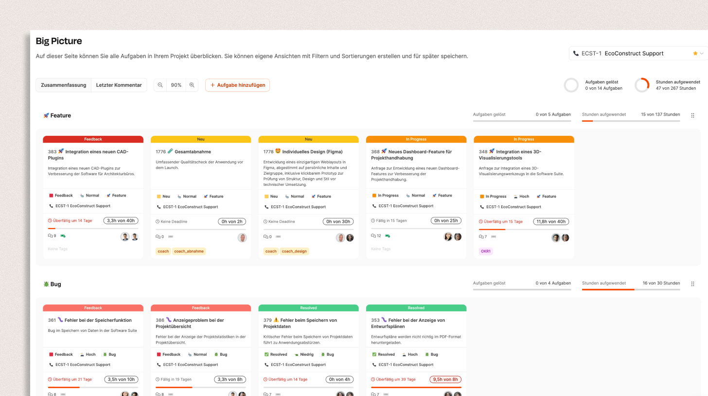 For example: In a meeting, a customer decides that a certain feature is top priority for them, while a bug report is less urgent. The manager can update this in the Big Picture right away and set the order so the most important tasks stand out. This way, there’s a clear, shared view of what matters and the customer feels actively involved in planning.