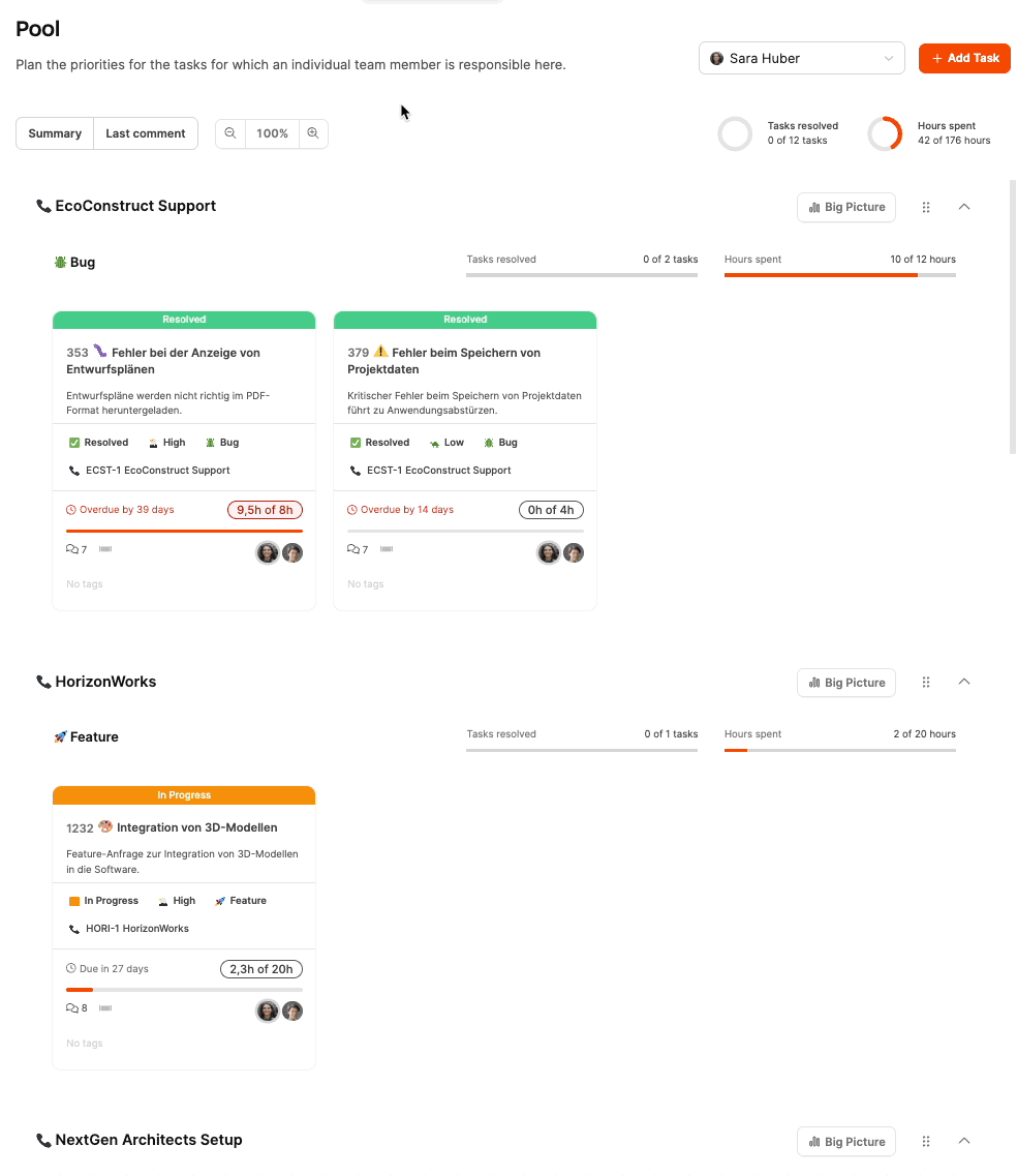 The pool view gathers all of an employee’s tasks that are listed in the Accountable field. This allows team leads and account managers to plan together which tickets should be handled in which order.