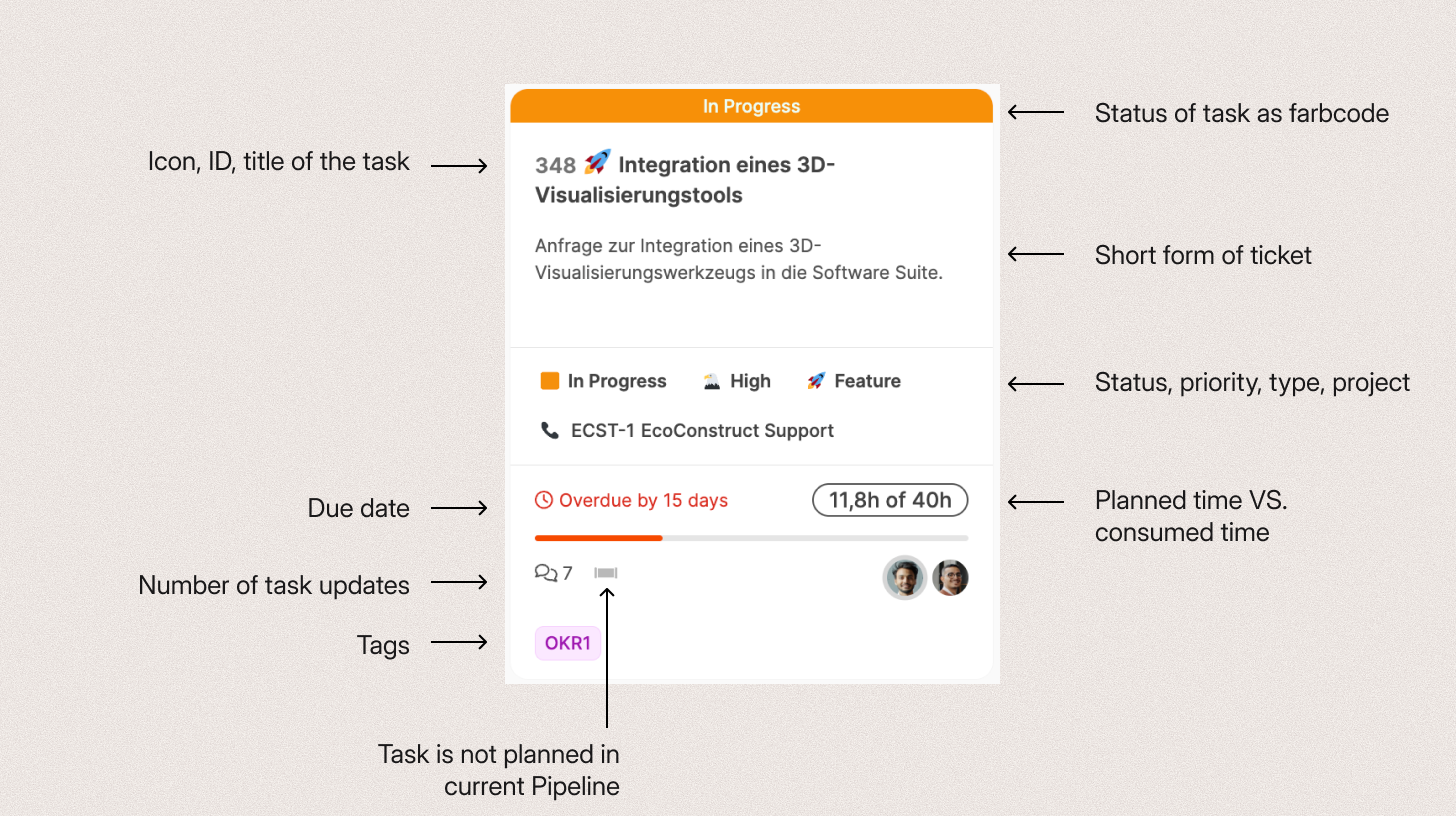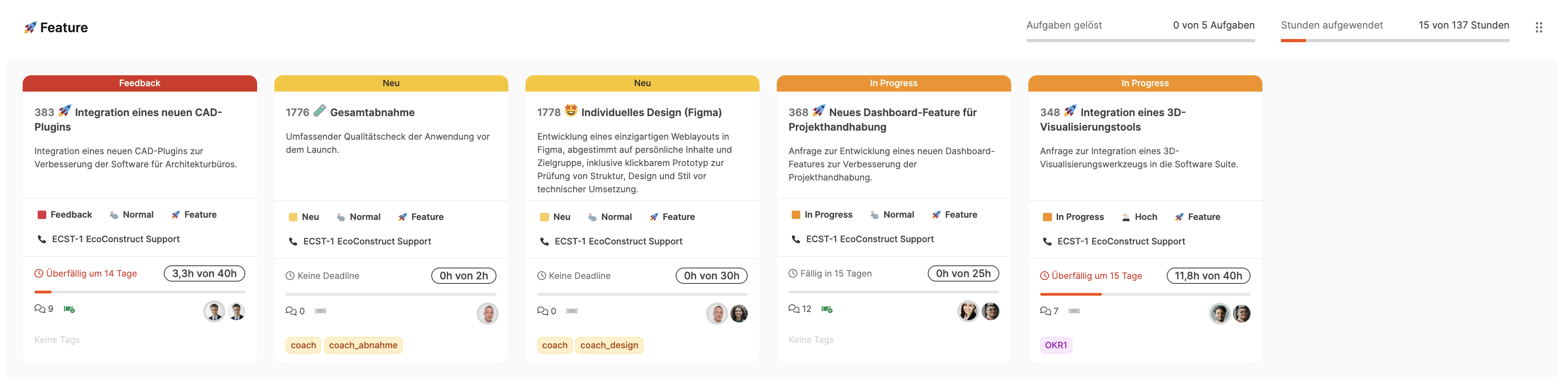 With the progress bar and the comment view, blockers and open questions can be spotted quickly.
