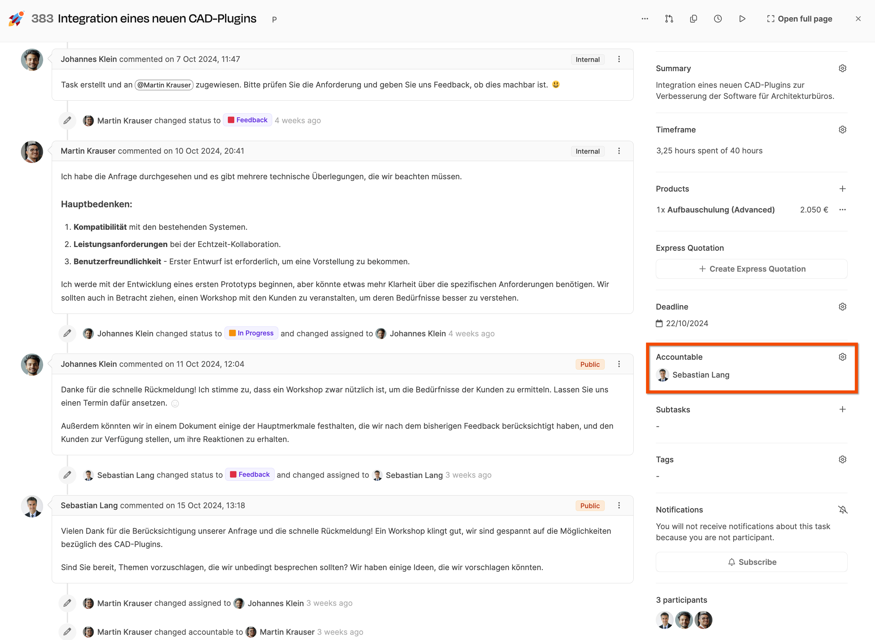Responsibility can be changed at any time, for example when handing over a customer or project internally.